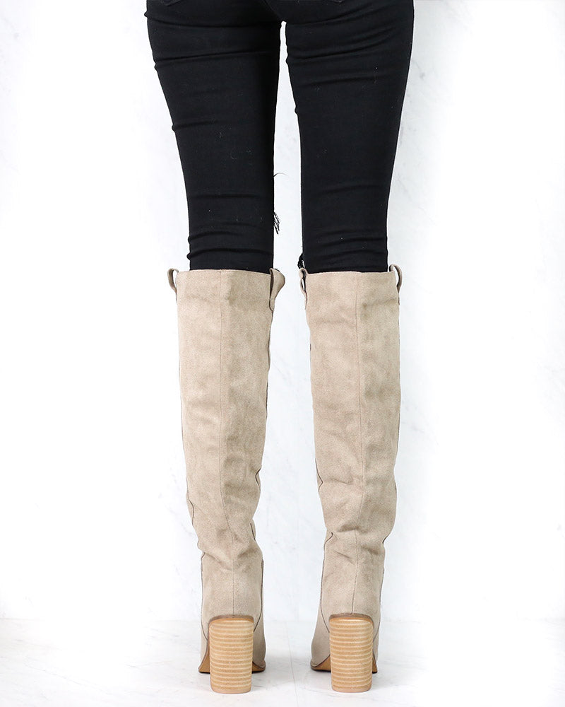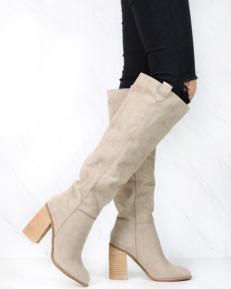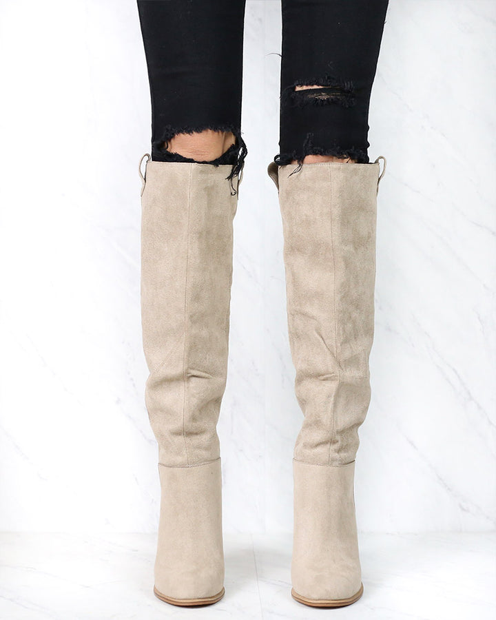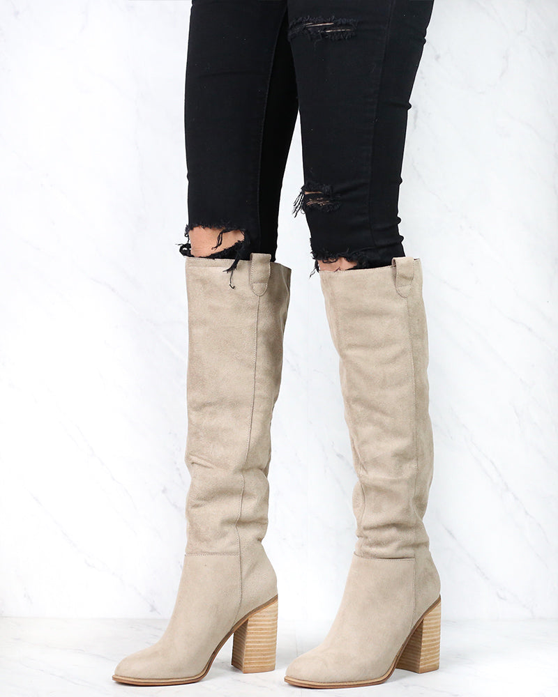 These knee high boots are perfect for the fall and winter seasons! Featuring distressed faux suede, slip-on design, rounded toe, wood stacked heel and a slouchy ankle, these boots are perfect for any outfit! Pair these boots with a lace cami tank, leopard mini skirt, and a leather jacket.