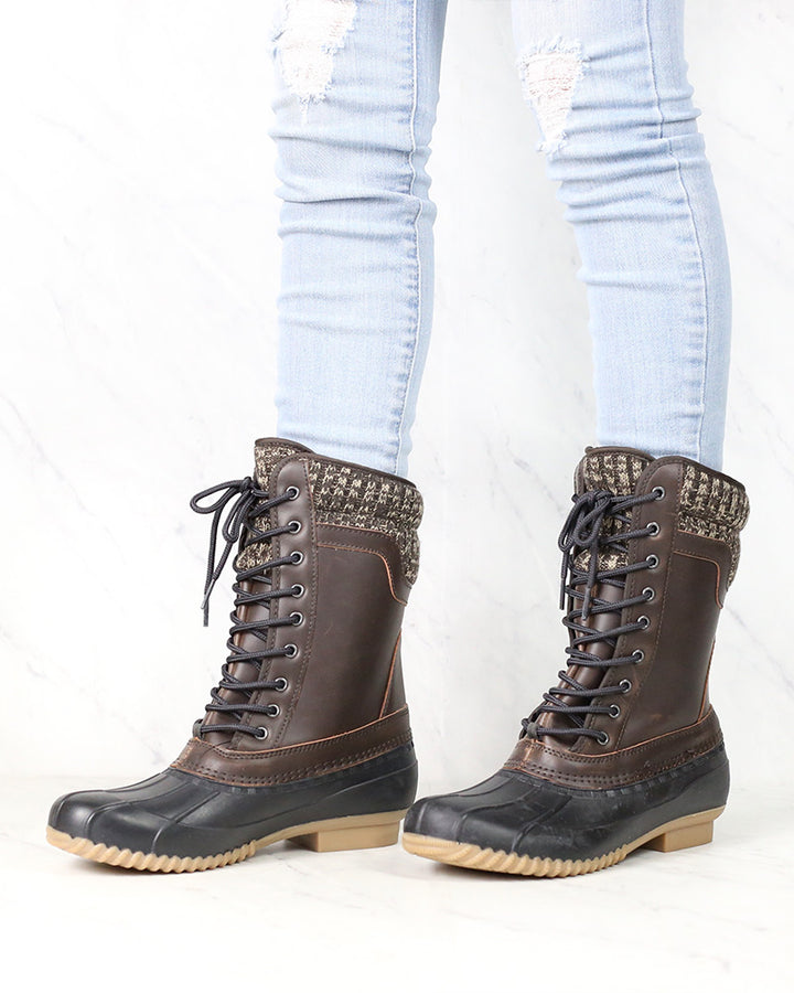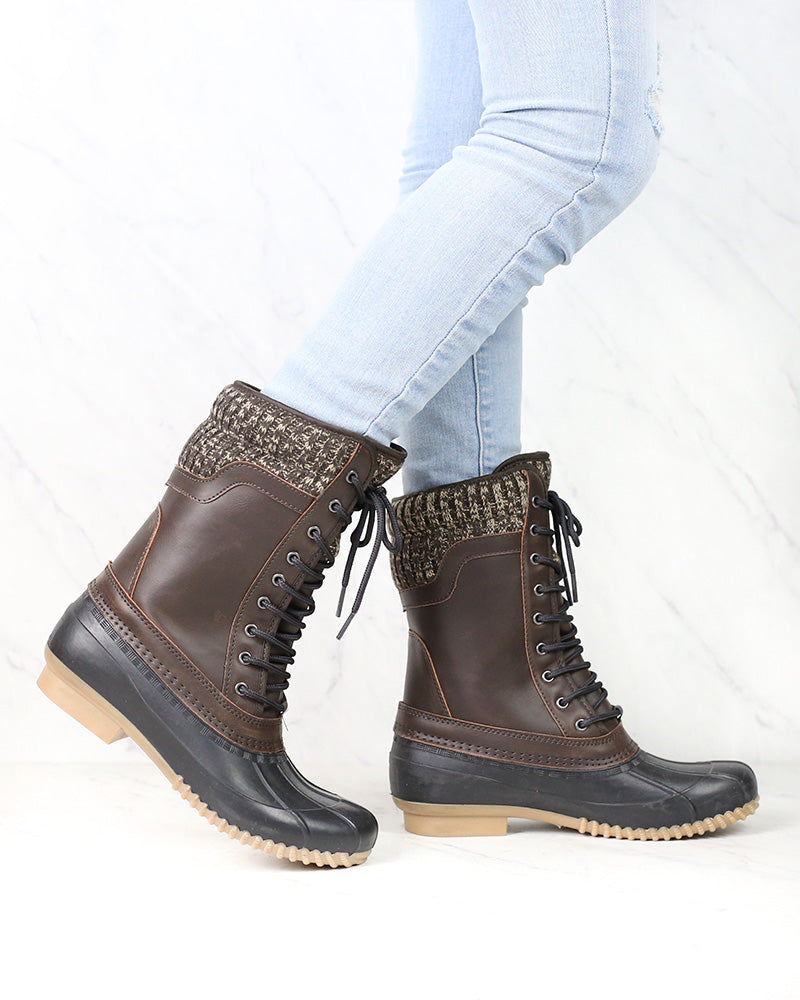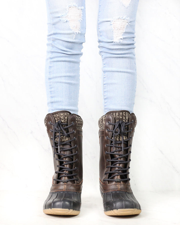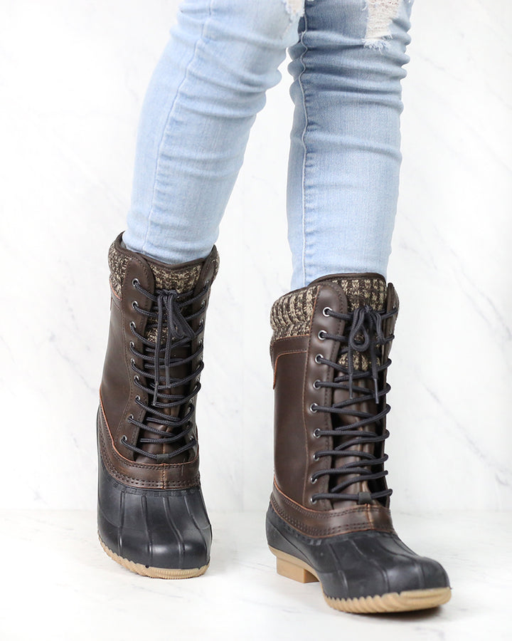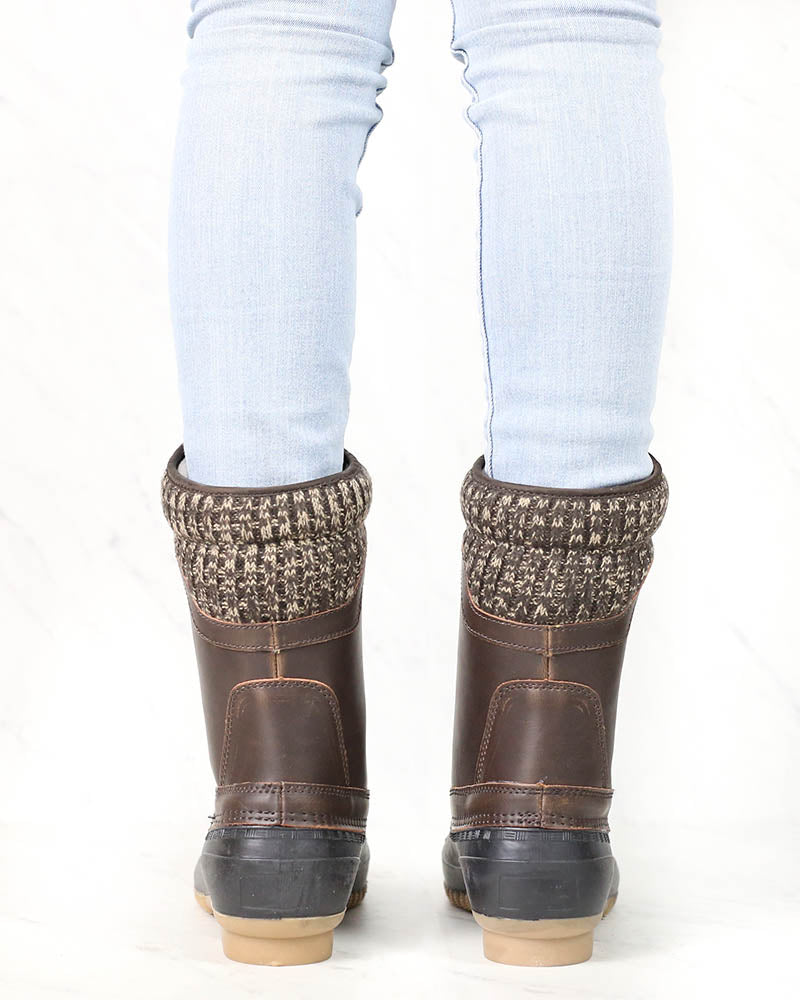 These eye-catching sweater cuff lace-up mid calf boots are something you don't want to miss! Featuring a sweater cuff and rubber sole, these boots are definitely a unique find. Wear these with your favorite sweater and skinny jeans to complete your winter look!
