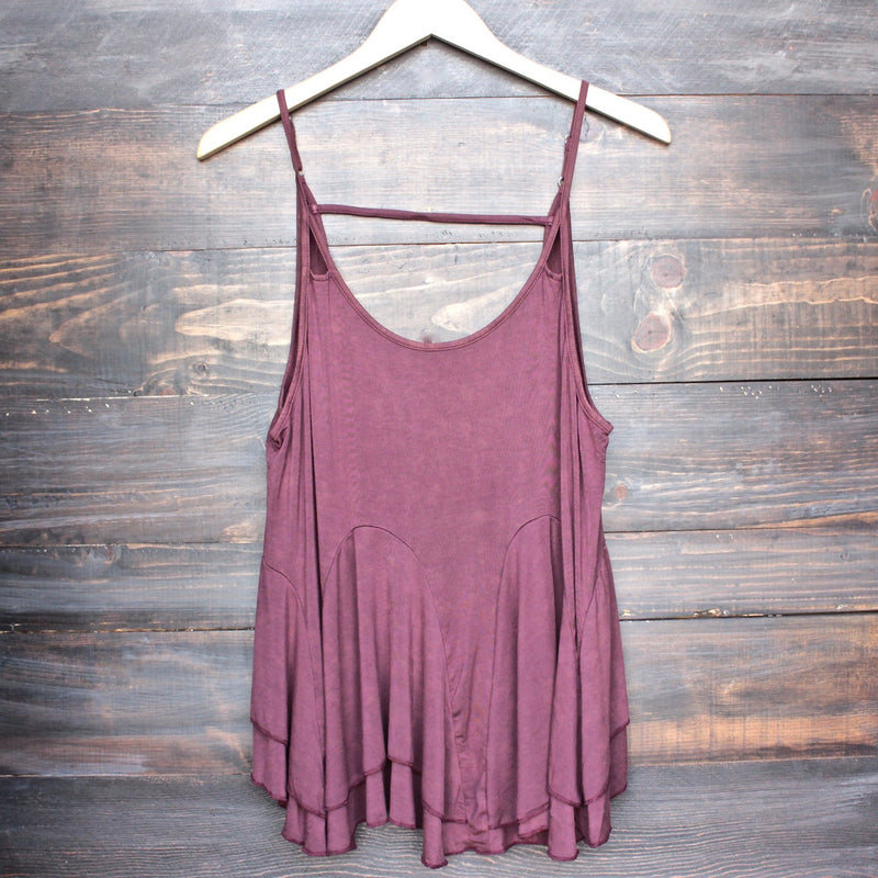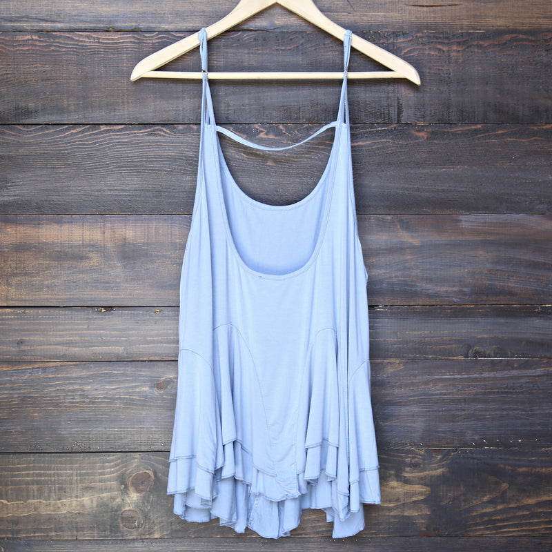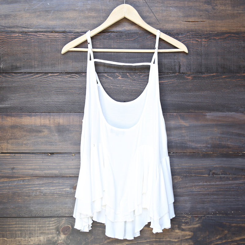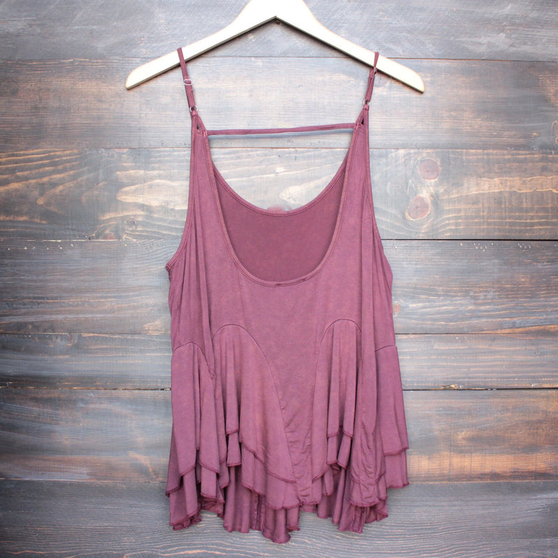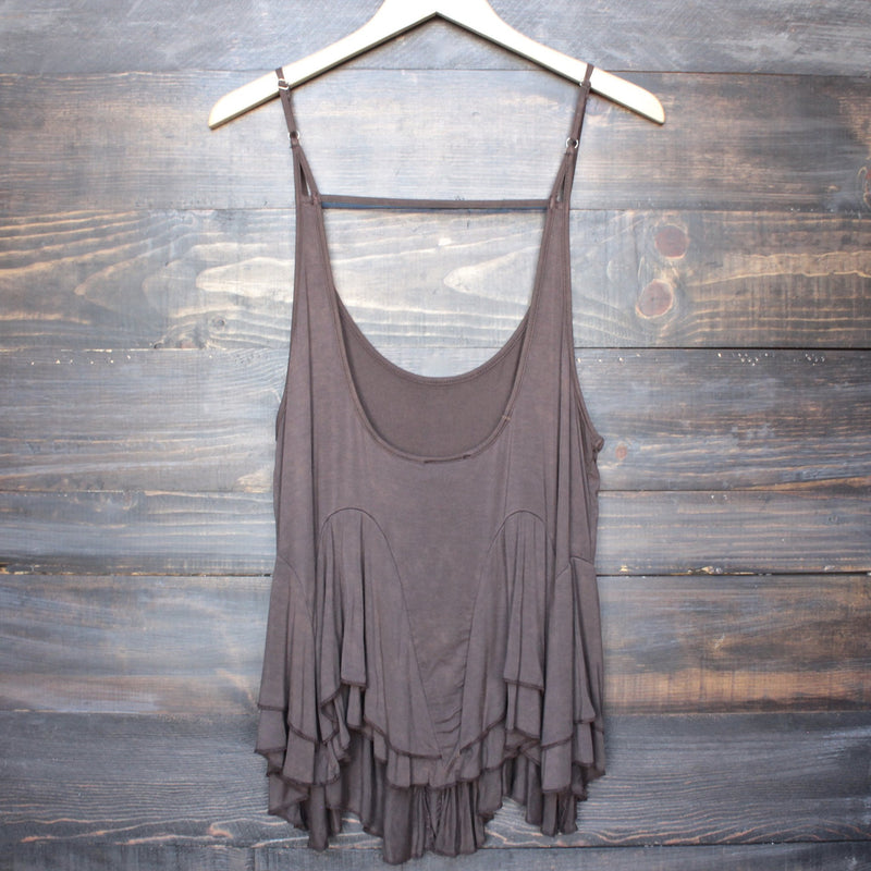 Super-soft cotton blend tank that features an uneven hemline, cascading ruffles, adjustable straps, and an open back.
