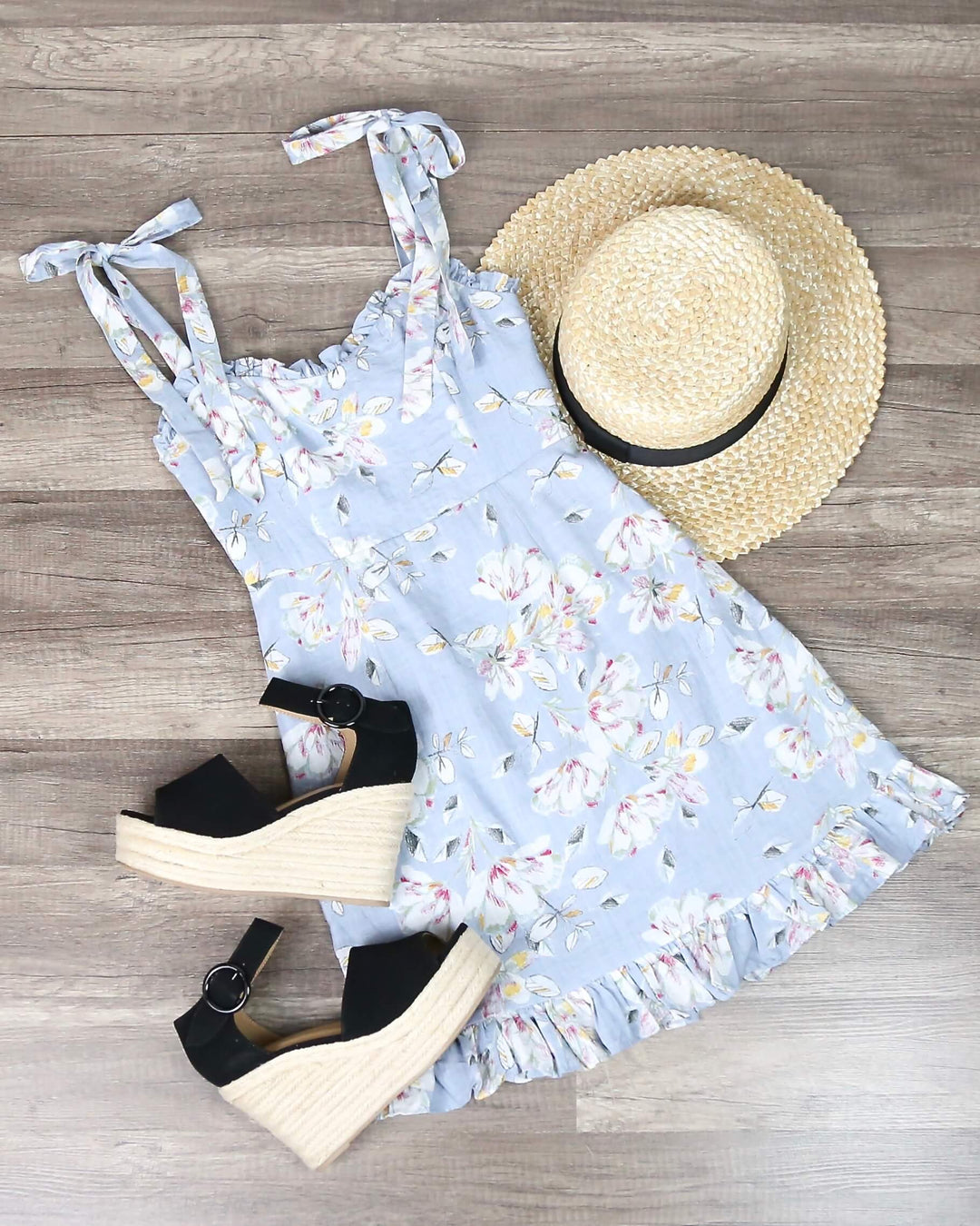 Floral Dress with Ruffled Hem and Shoulder Ties in Grey