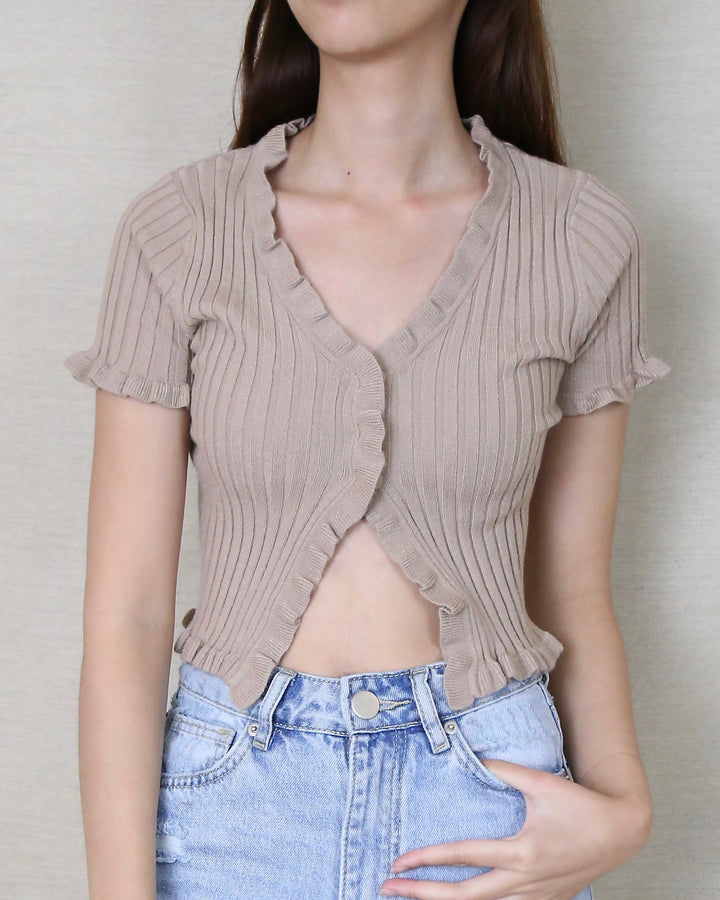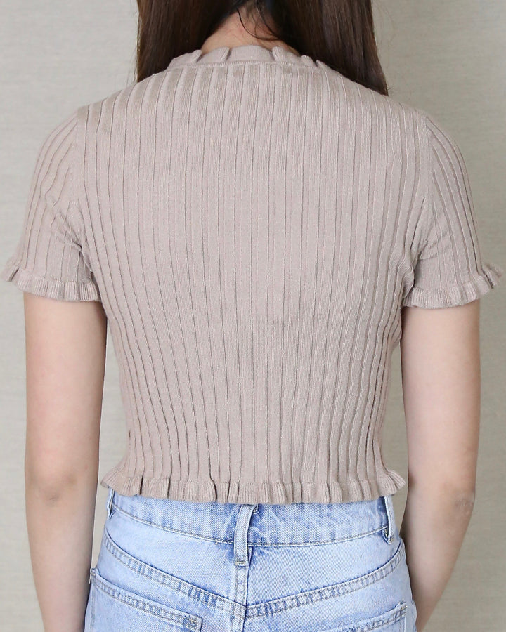 Our Layla crop top is perfect for spring and summer seasons! Featuring a ribbed knit design, lettuce hem detail, three button closure, this top would be super cute with some denim shorts and some ankle booties!