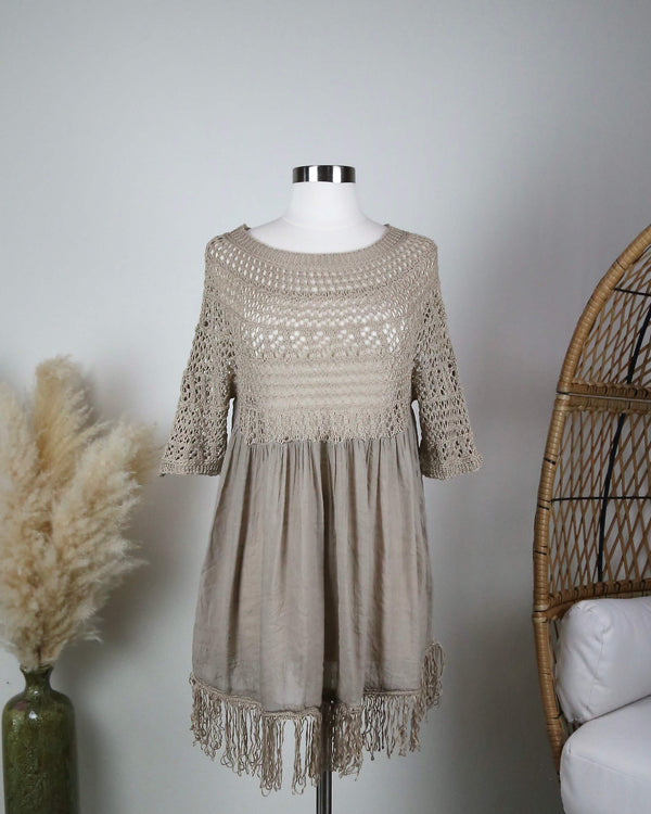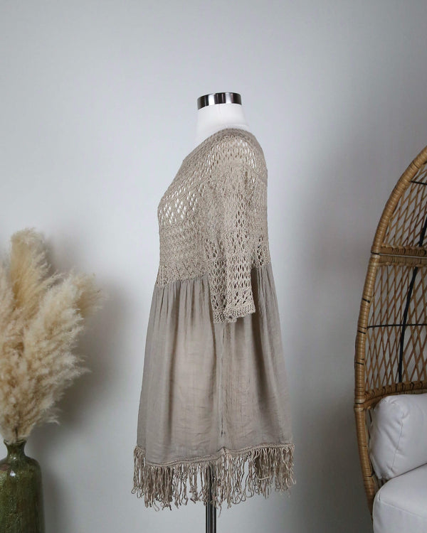 Two Tone Lightweight Boho Pull Over Sweater Tunic Hoodie with Lace Hem in Grey