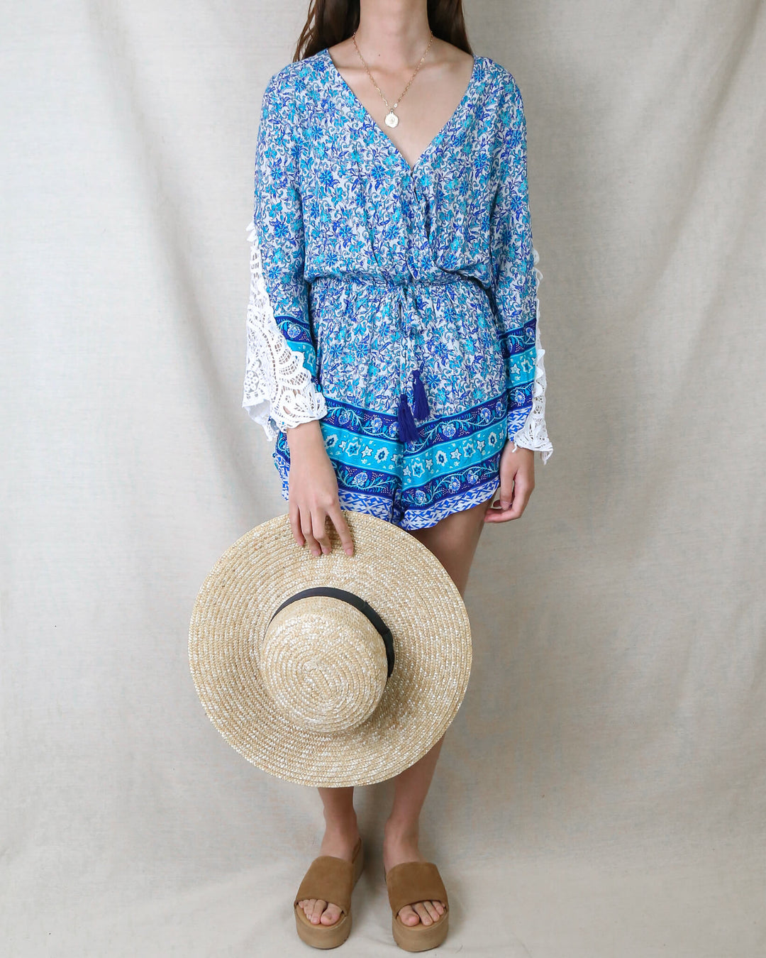 Reverse - Aqua Blue Boho Print Romper with Crochet Lace Bell Sleeves