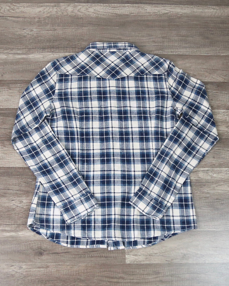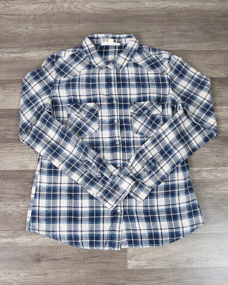 Vintage Affair Soft Button Up Plaid Flannel Long Sleeve Shirt in Navy Blue