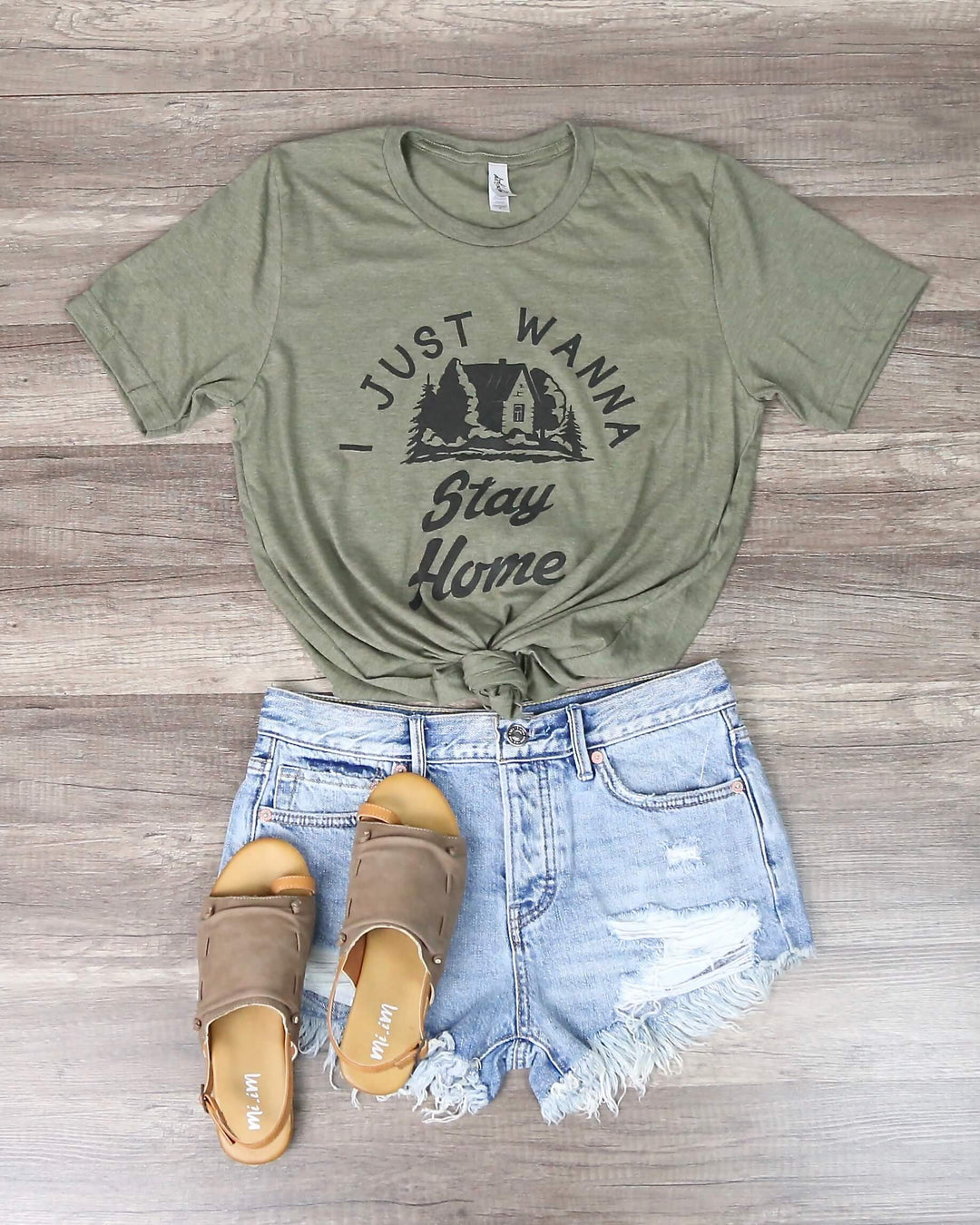 This super cute "I Just Wanna Stay Home" tshirt is a graphic tee to lighten the mood. Pair this with denim shorts for a casual and cute look!