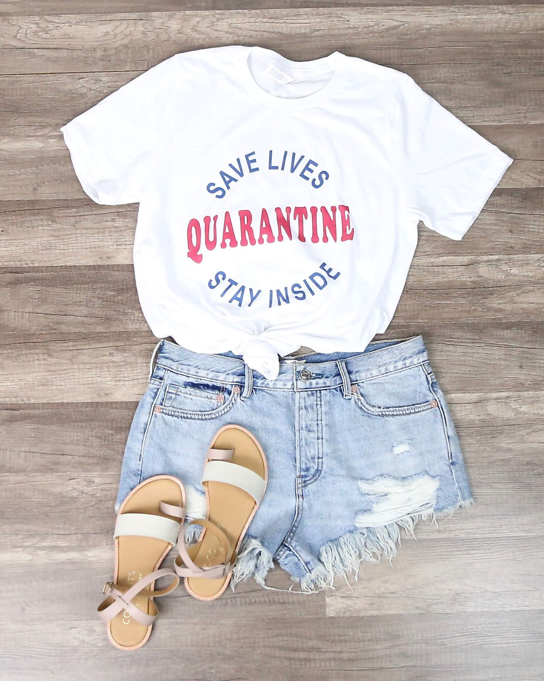 This super cute "Save Lives, Stay Inside" tshirt is a graphic tee to lighten the mood. Pair this with denim shorts for a casual and cute look!