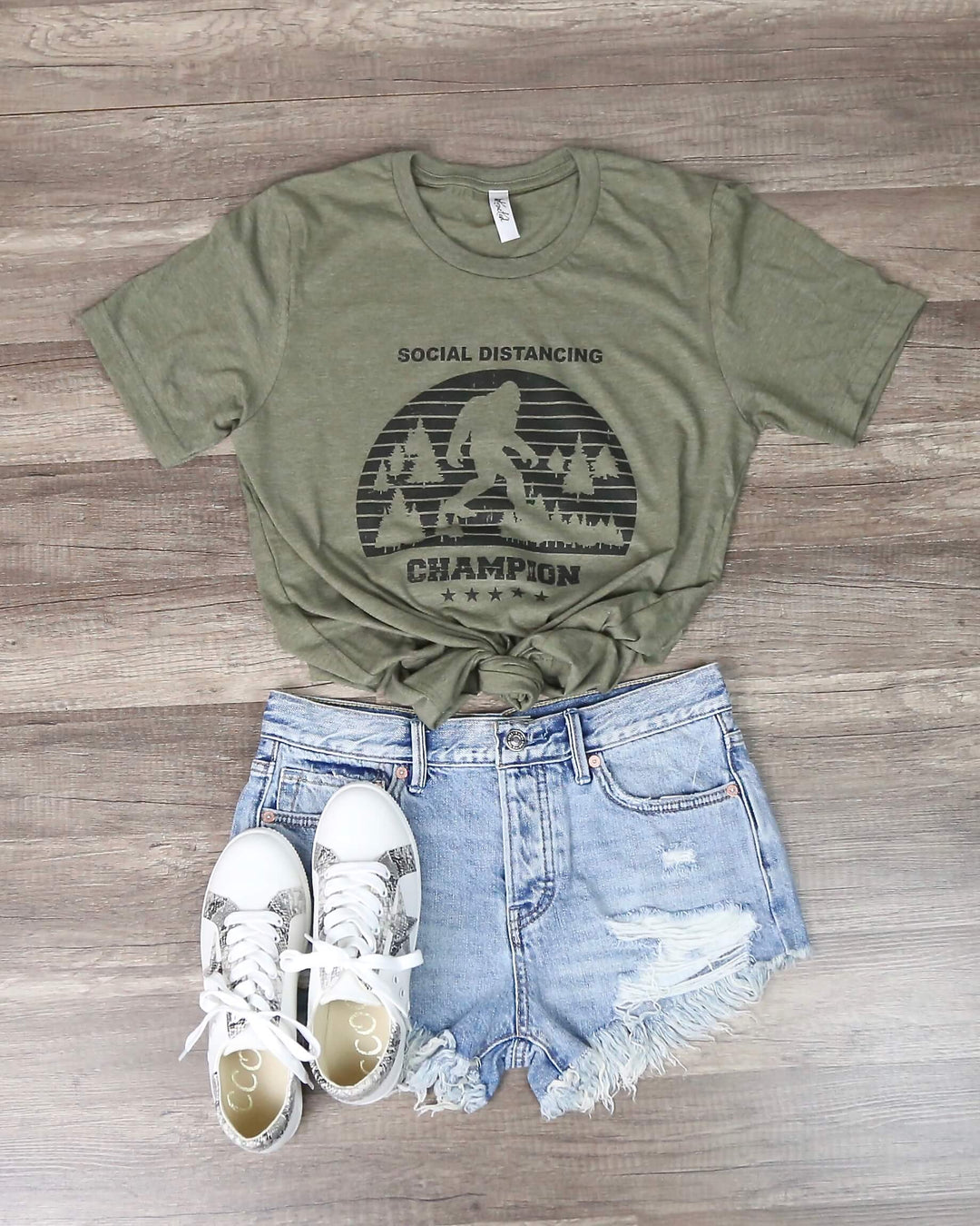 This super cute "Social Distancing Champion" tshirt is a funny graphic tee to lighten the mood. Pair this with denim shorts for a casual and cute look!