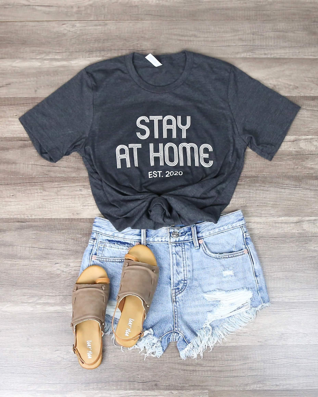 This super cute "Stay At Home" tshirt is a graphic tee to lighten the mood. Pair this with denim shorts for a casual and cute look!