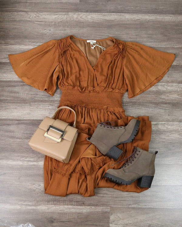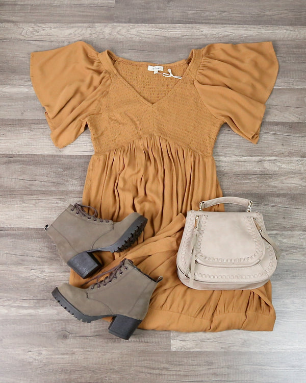 Whitney Washed Satin Ruffled Smocked Bodice Midi Dress in Dusty Camel
