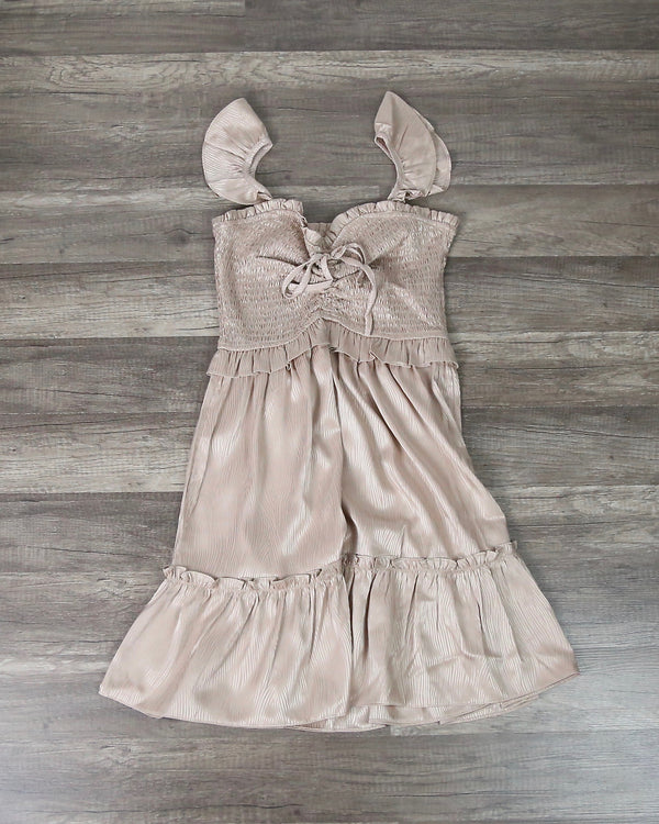 Satin Heart Neckline Smocked Bodice Mini Dress in Champagne