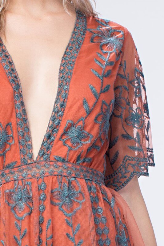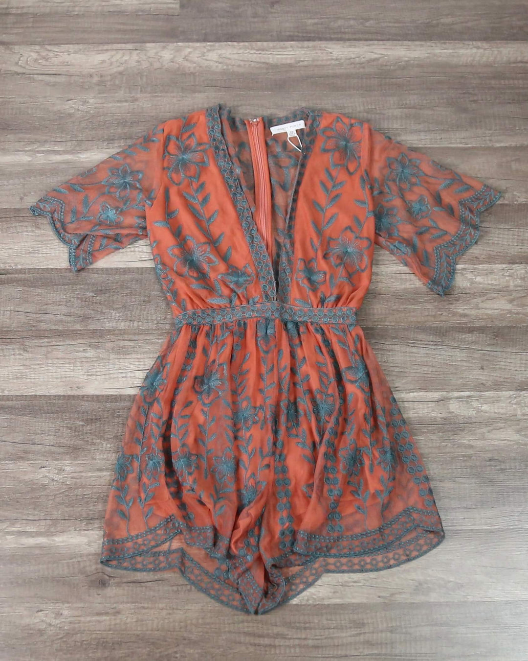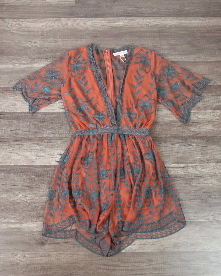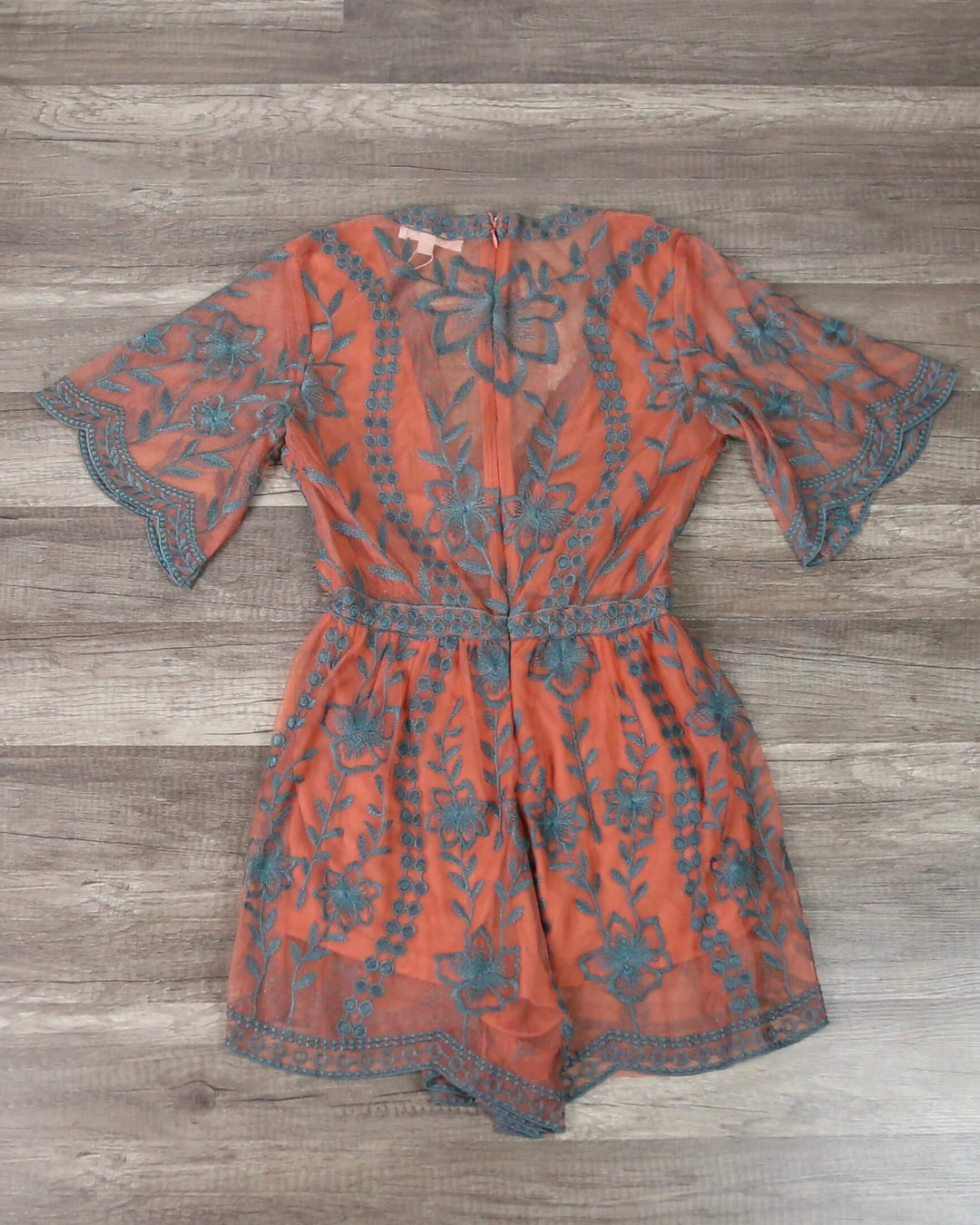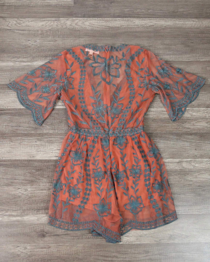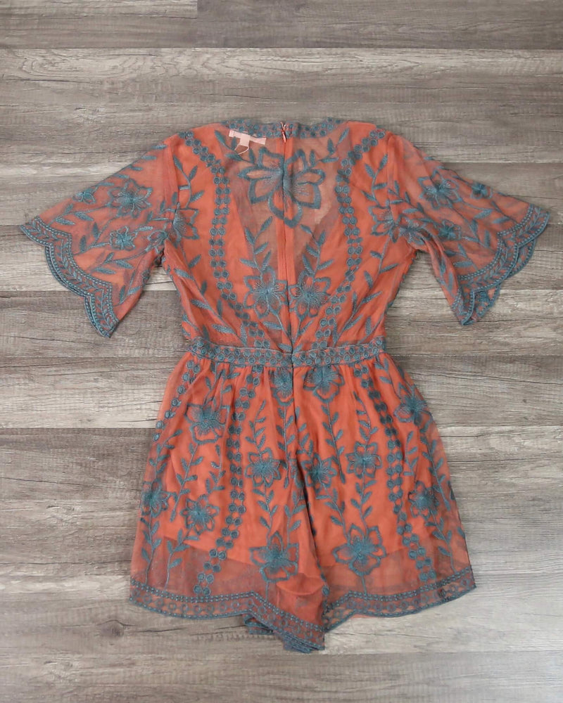 Honey Punch - As You Wish Contrasting Embroidered Lace Romper in Dusty Rust