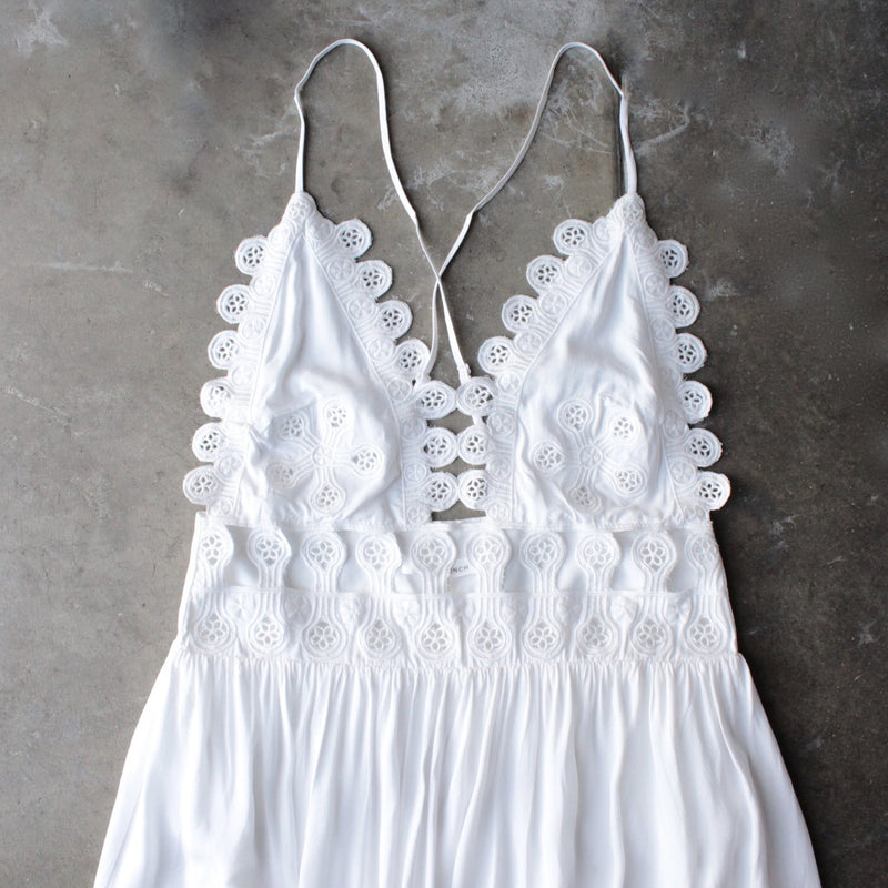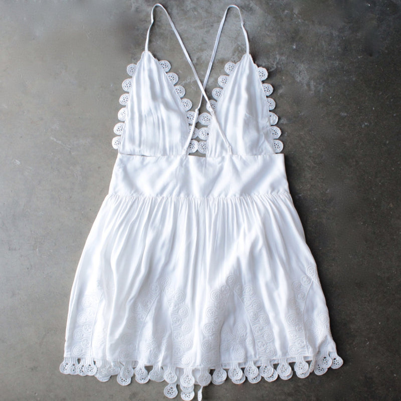 This embroidered mini dress has wavy cutouts and an open back for a flirty feel. Draped teardrops trim the hem. Adjustable, crisscross straps. Lined. Runs big!