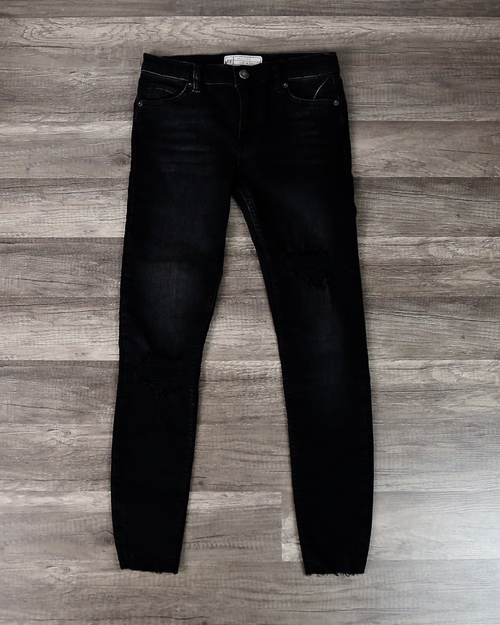 Faded skinnies cut in a flattering mid-rise silhouette with shredded holes and raw, cropped hems are a seasonless staple.