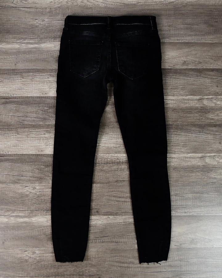 Mid-rise skinny jeans featuring rip dealing on the knees and a frayed distressed hem.