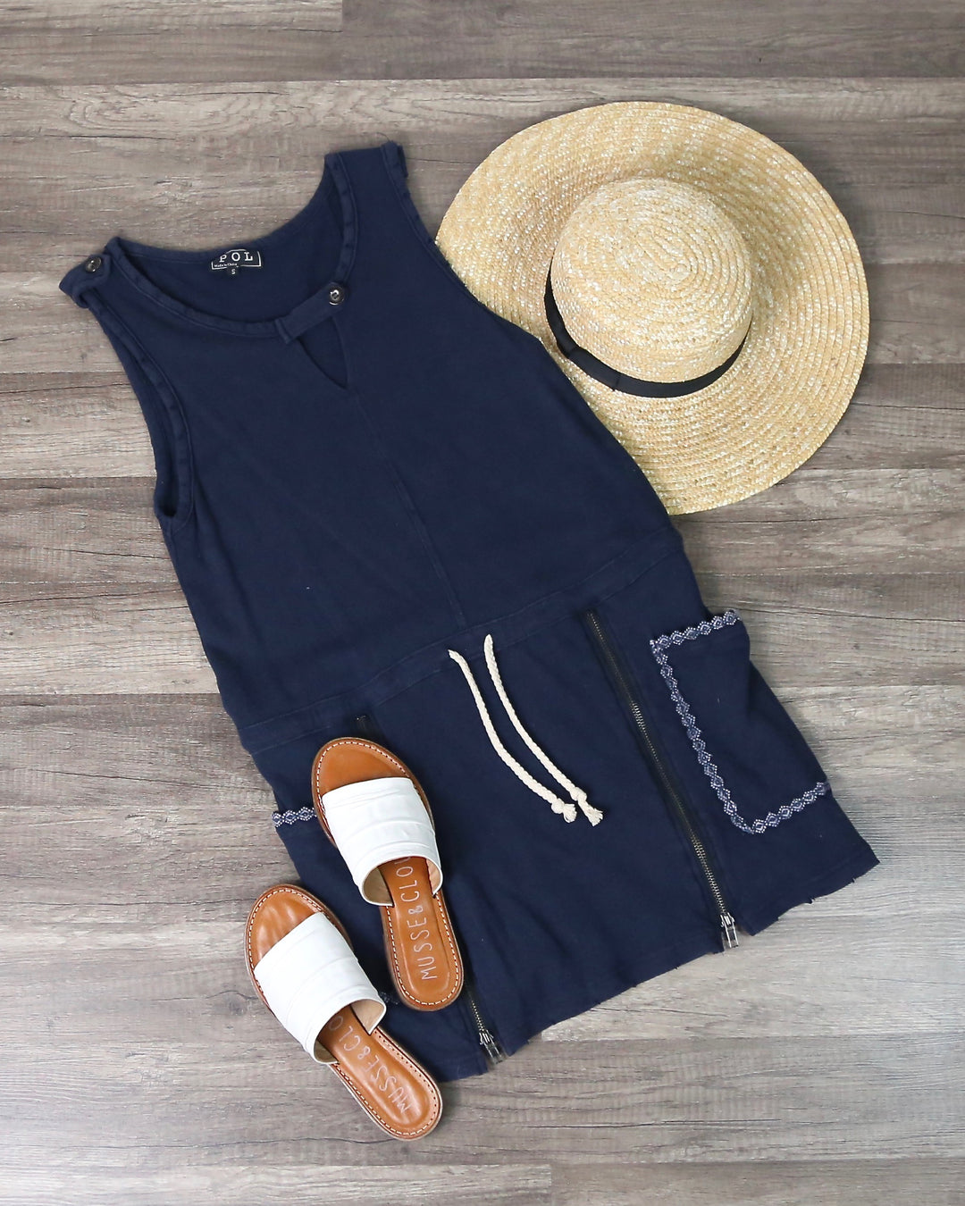 This mini dress is an essential when you want to stay comfy and look cute with its unique aspects! Featuring a peek-a-boo v-neck detail, drawstring waist, embroidered pockets, and zippers in the front, this dress is super cute paired with sandals!