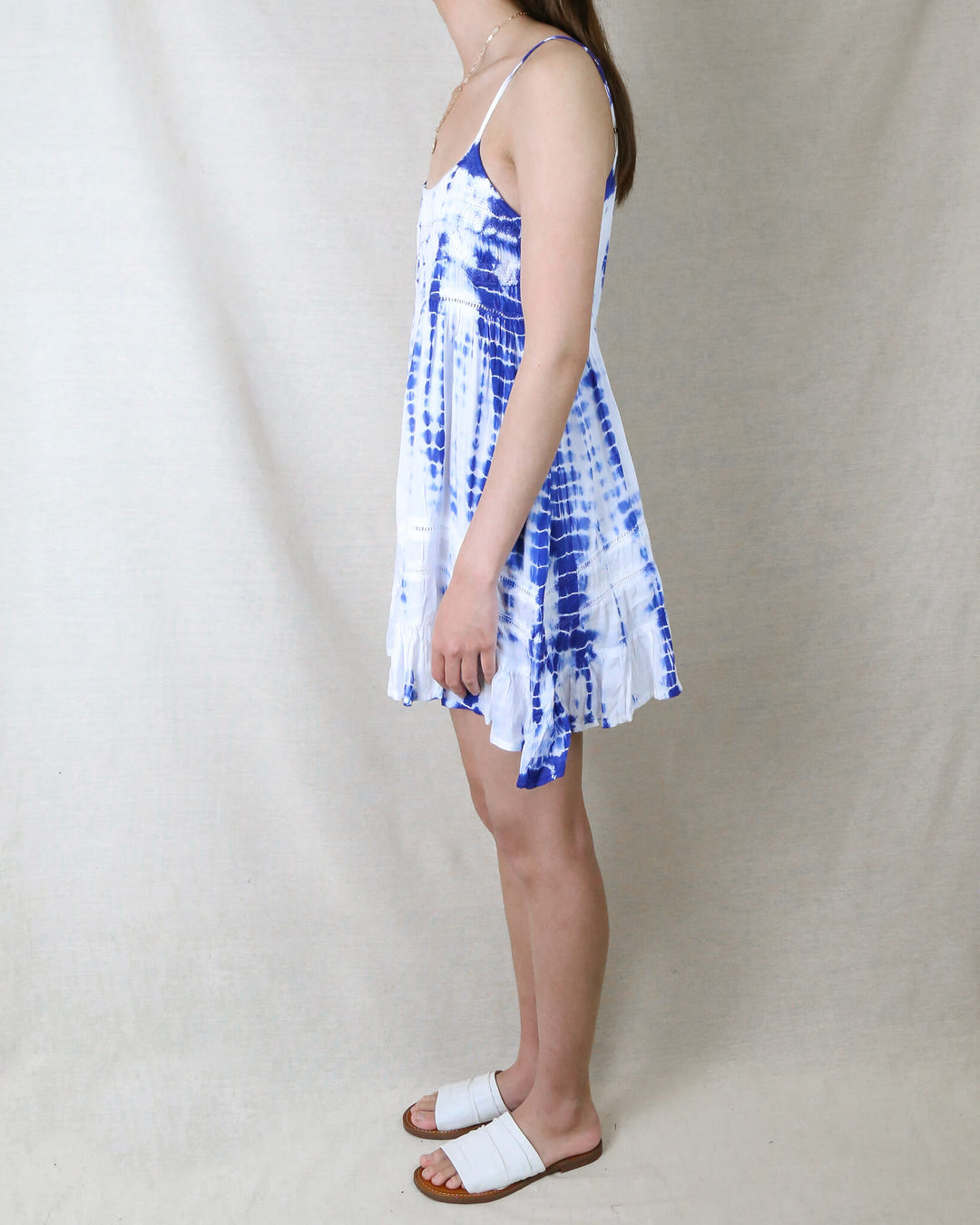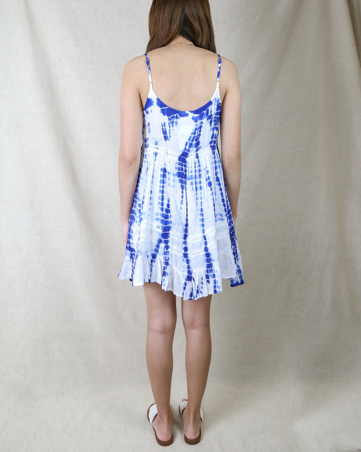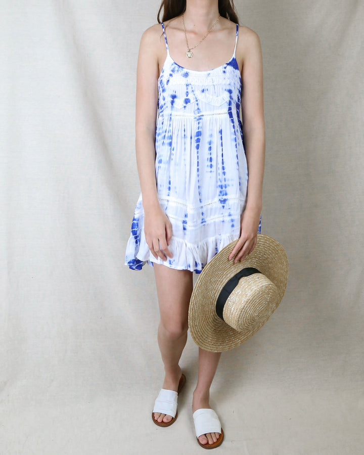 This tie dye dress is to die for with its gorgeous details on a basic dress! Featuring a blue tie dye print, fully adjustable straps, ruffled hem, and is fully lined, this mini dress is perfect for the summer. Pair this dress with some sandals or flatforms to a day on the beach!