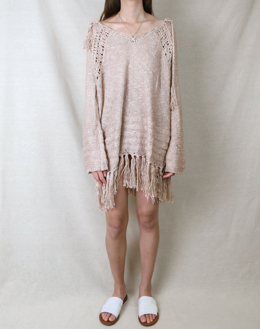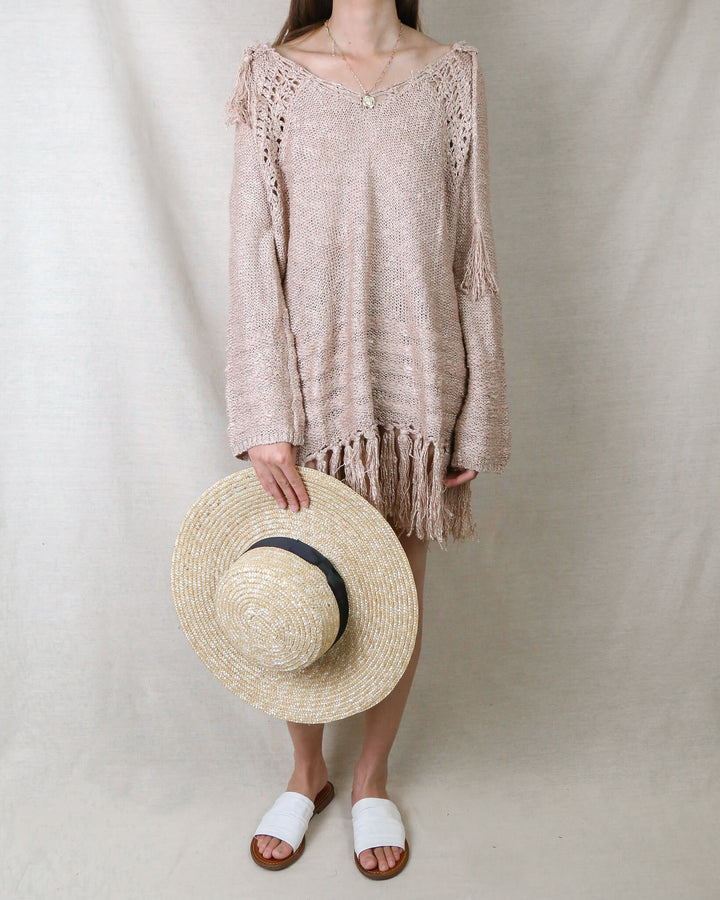 Warm and cozy dusty pink pull over hoodie with fringe hem and tassels that is perfect as a bikini coverup! This will not only keep you warm after swimming, but it is also super cute!