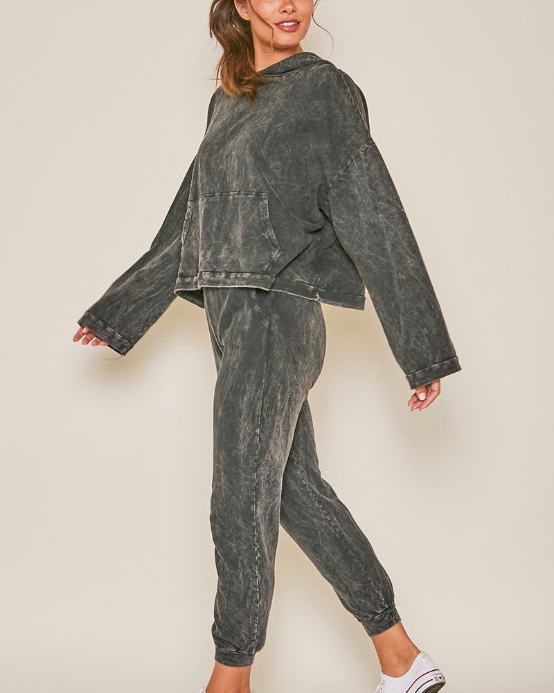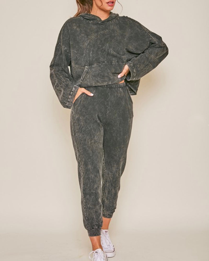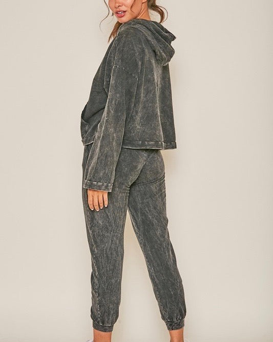 This set features a long sleeve knit cropped hoodie with pockets and a high waisted mineral washed sweatpants with pockets. This set is perfect for those comfy days where you want to look cute and stay cozy!