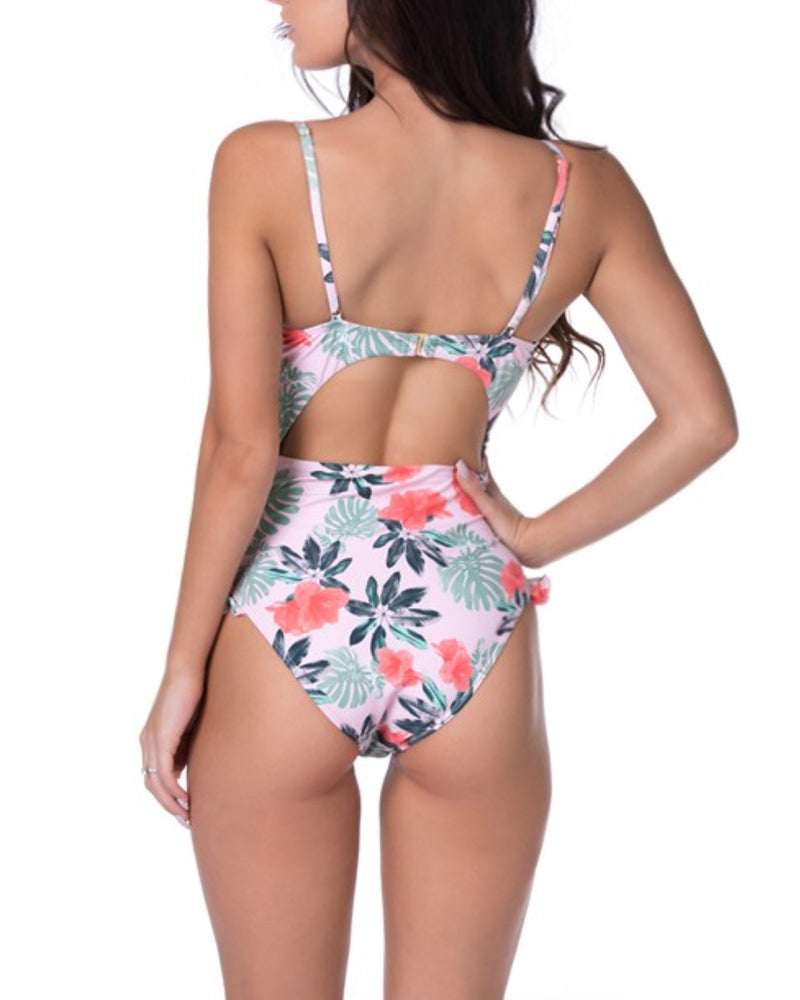 This one piece bikini is perfect to take on vacations! Pink floral one piece featuring ruffle trim, removable padded cups, adjustable shoulder straps, adjustable center bust tie, and back hook closure.