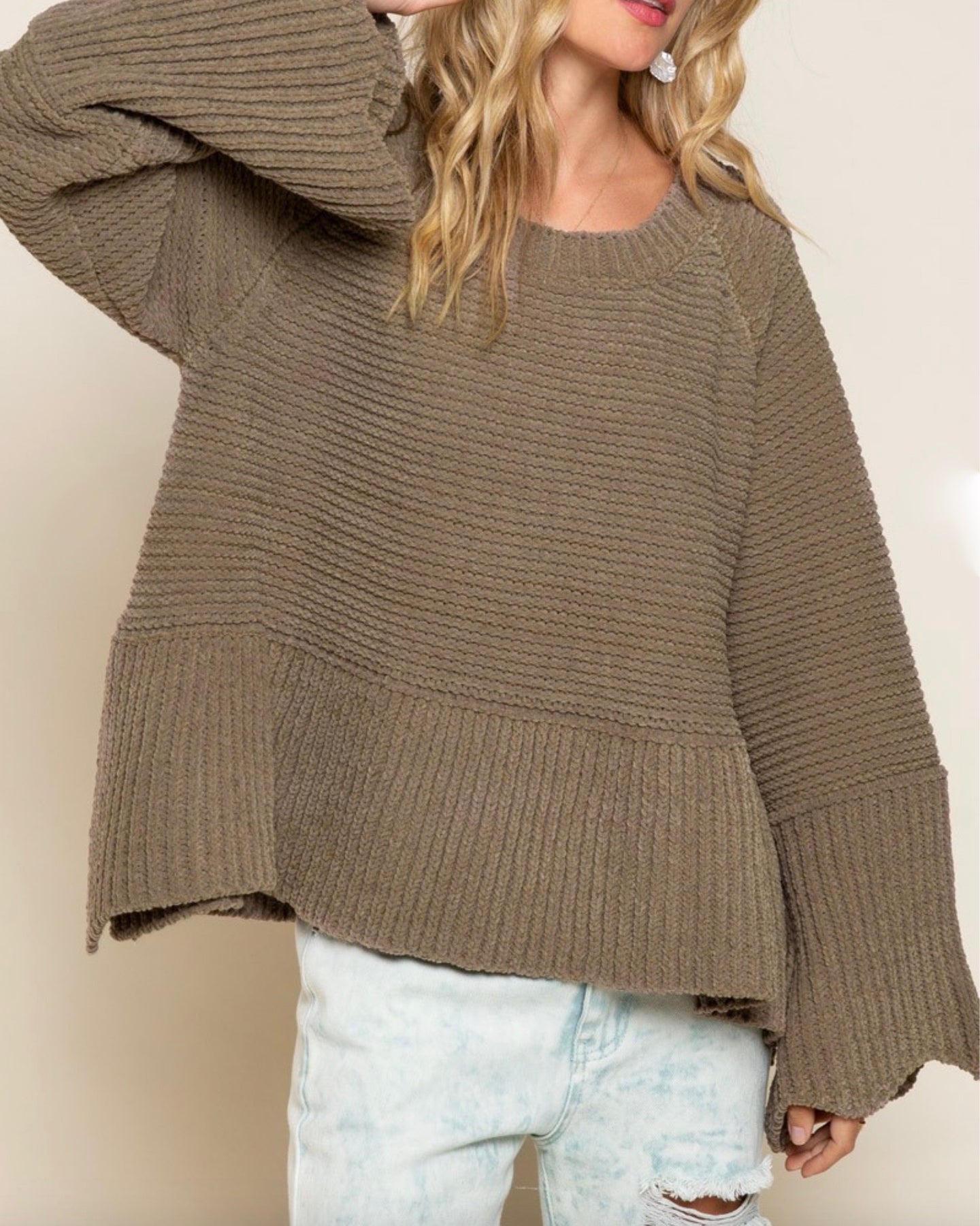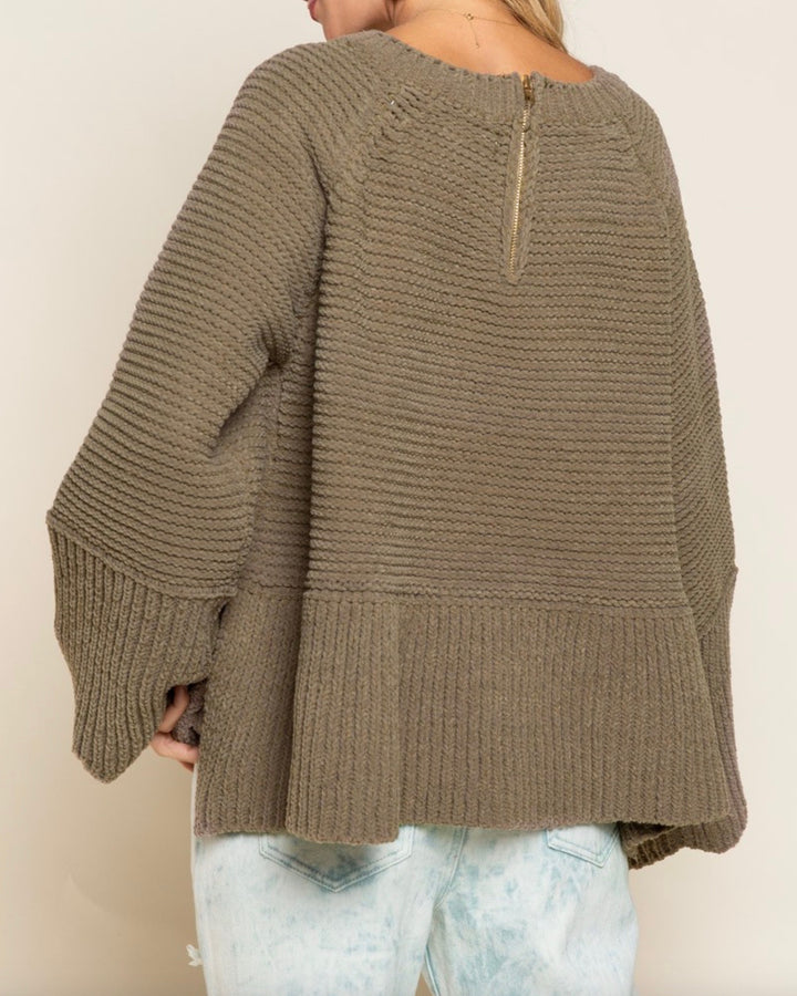 Sweater weather is here for this fall and winter season! This sweater is super cute, featuring a relaxed fit, round neckline, back zipper closure, bell sleeves with scallop edge detailing, and side slits. Pair this sweater with a pair of distressed jeans and ankle booties!