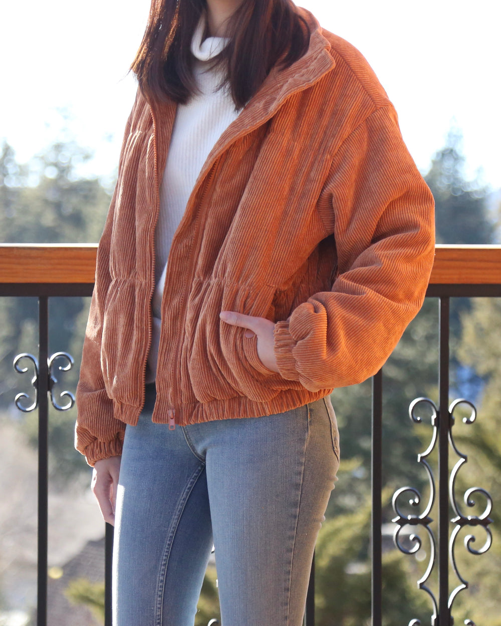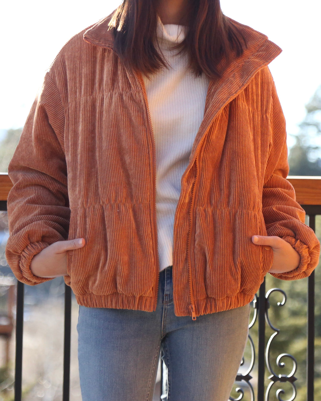 Cassidy Corduroy High Collared Bomber Jacket in Camel