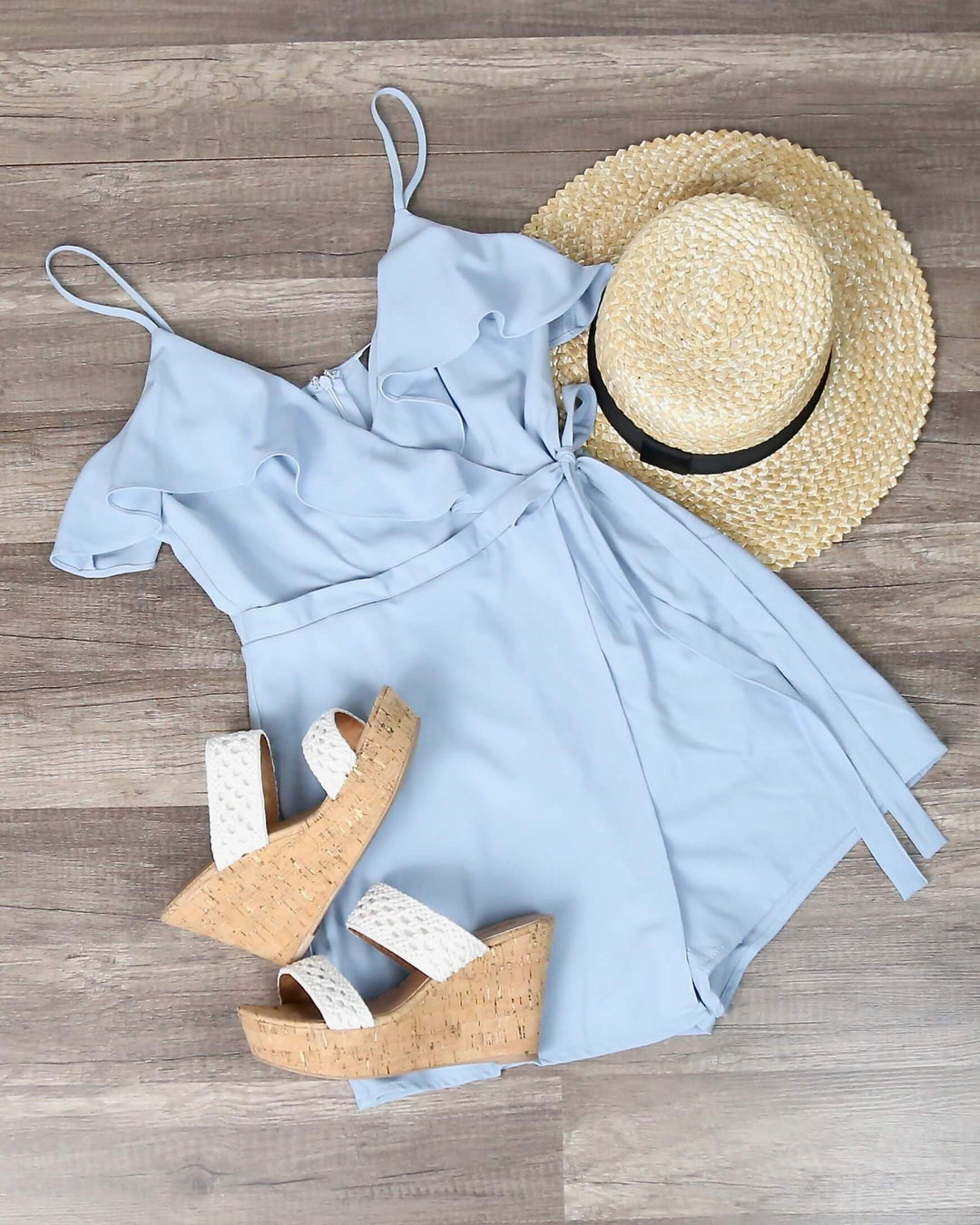 A dressy romper that is perfect for any event, being playful yet casual enough to wear any day! This v-neck sleeveless romper includes a ruffle detailing, asymmetrical effect, and a tie at the waist for a flirty effect.