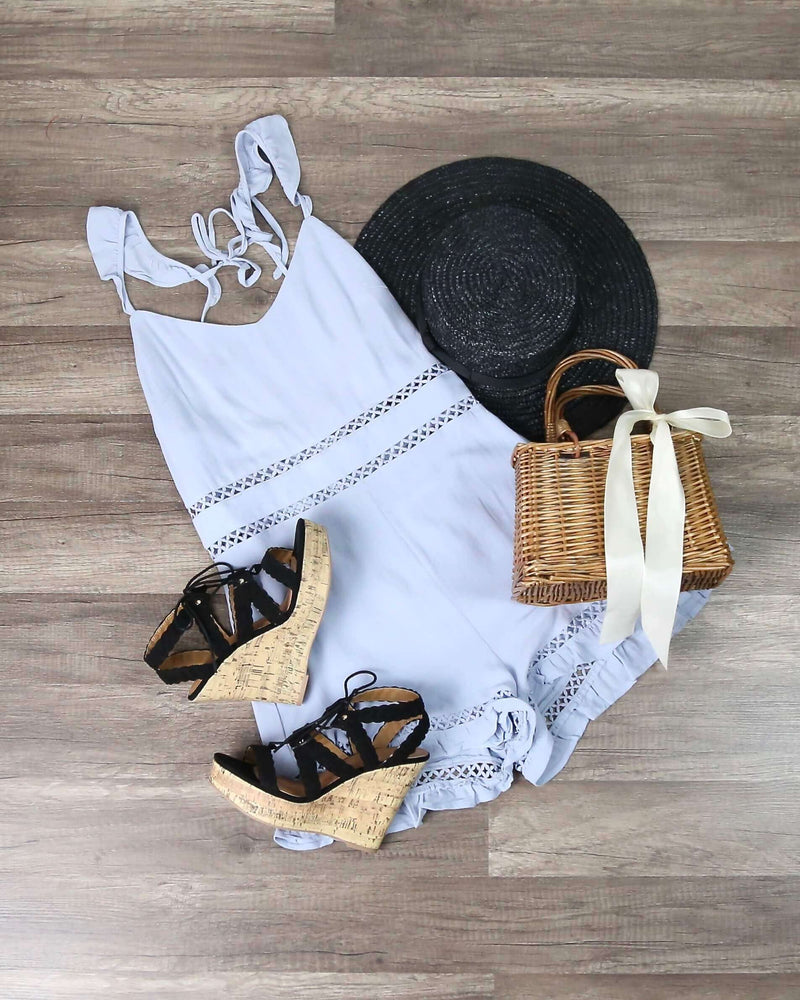 This gorgeous sleeveless romper with back tie, eyelet detailing, and ruffles along the legs is perfect for the summer. Wear this to any event with your favorite shoes!