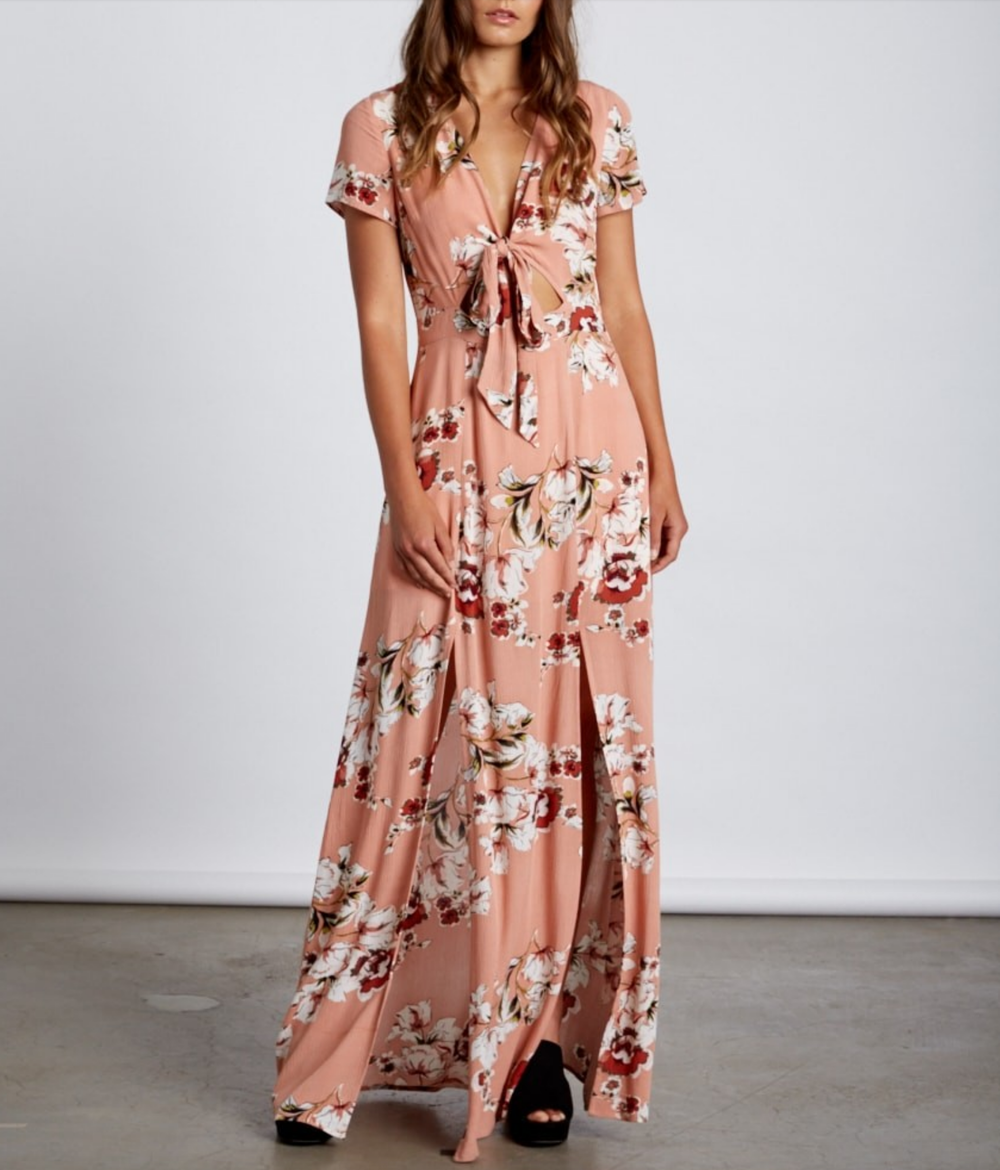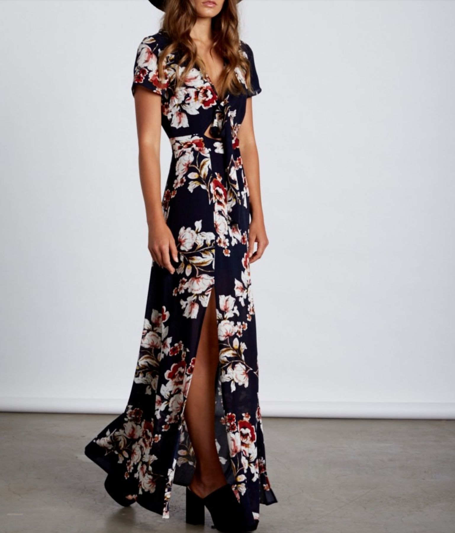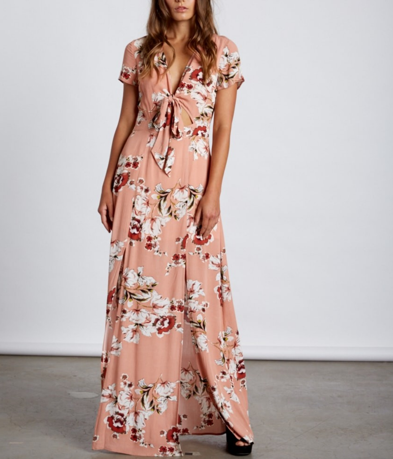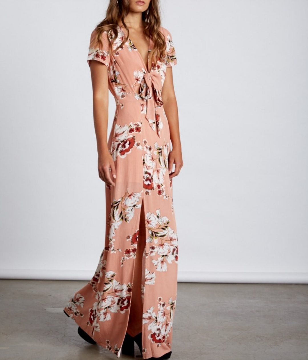 This dress is perfect for the spring/summer season! This dress features a maxi length, tie front, v-neck, and a slit that gives you a wow factor. Pair this dress with some sandals and you're good to go.