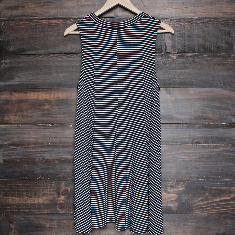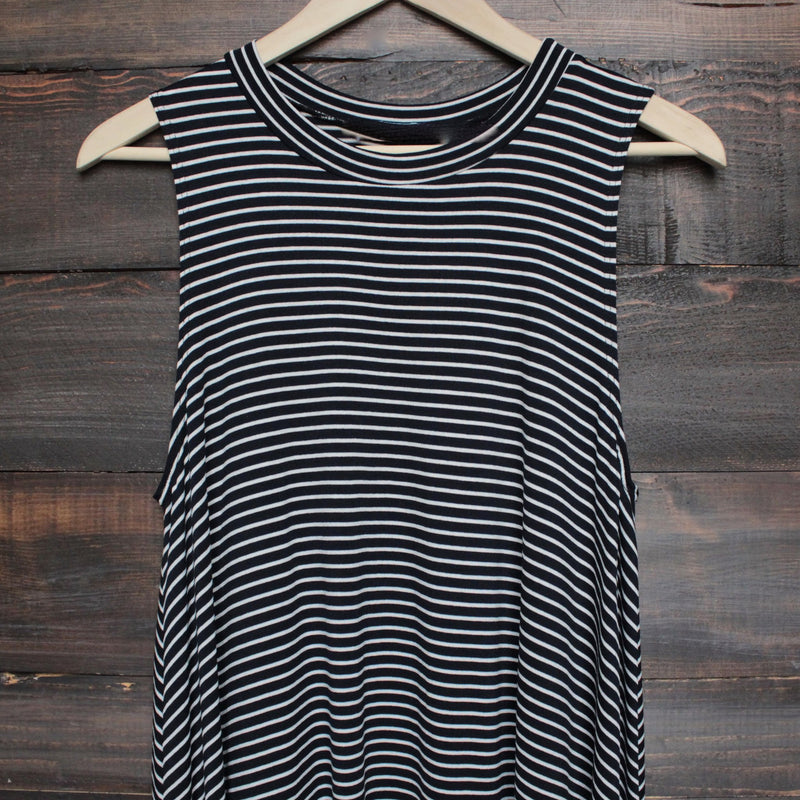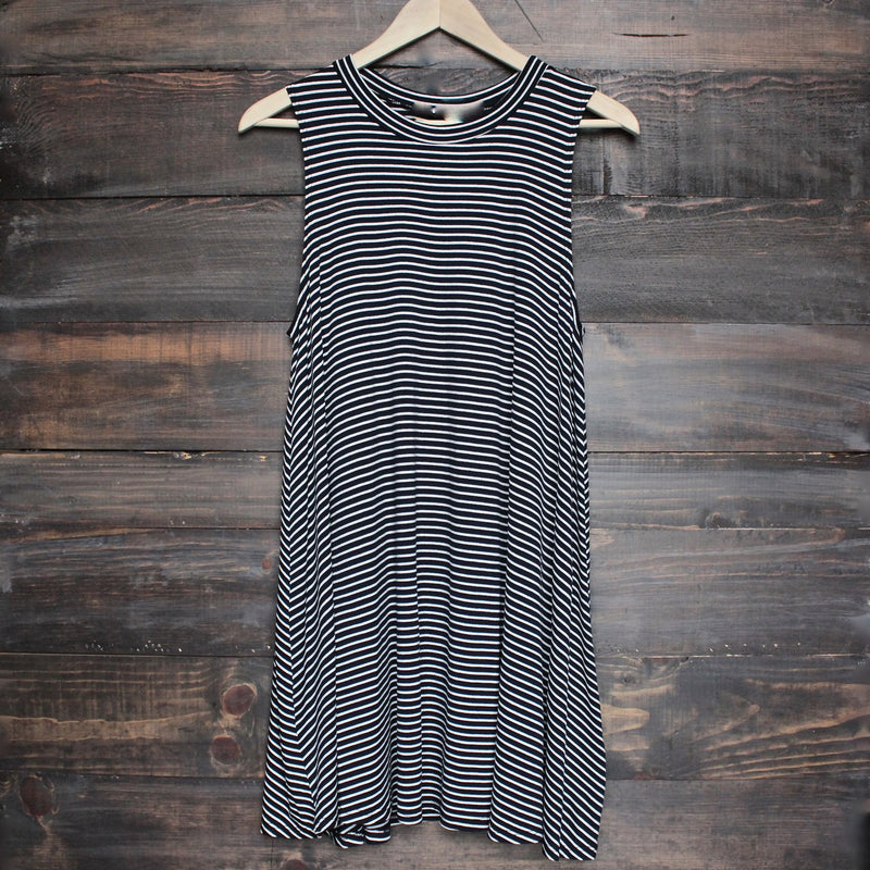This soft t shirt tank mini dress will become a staple in your wardrobe! Appears black but under sunlight will appear dark navy up close. The perfect casual chic combo with a feminine flare. Pairs perfectly well with a burgundy felt fedora, our antalya coin necklace, and our black chelsea boots!