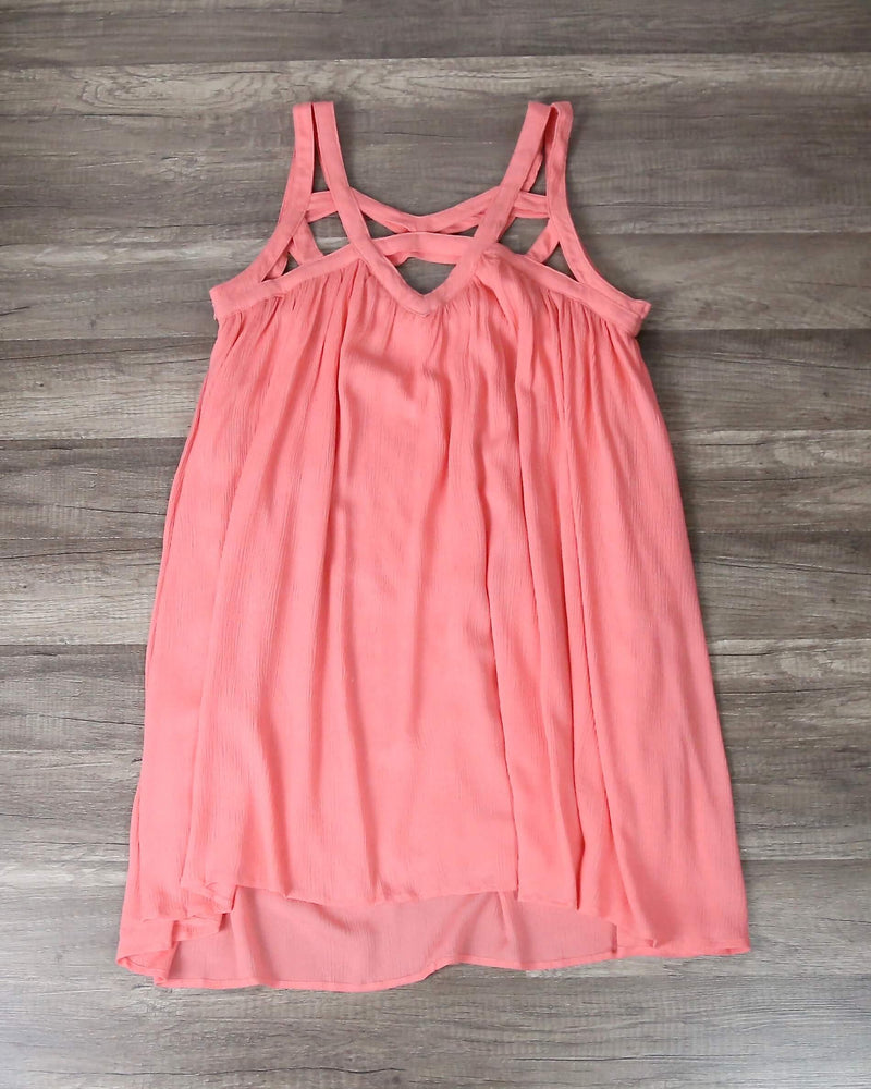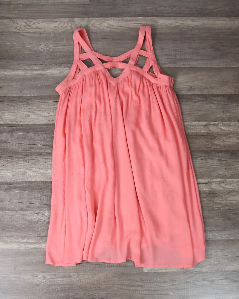 Cute summer flowy and oversize coral/salmon colored dress that features a caged top. Zipped side closure. Lined.