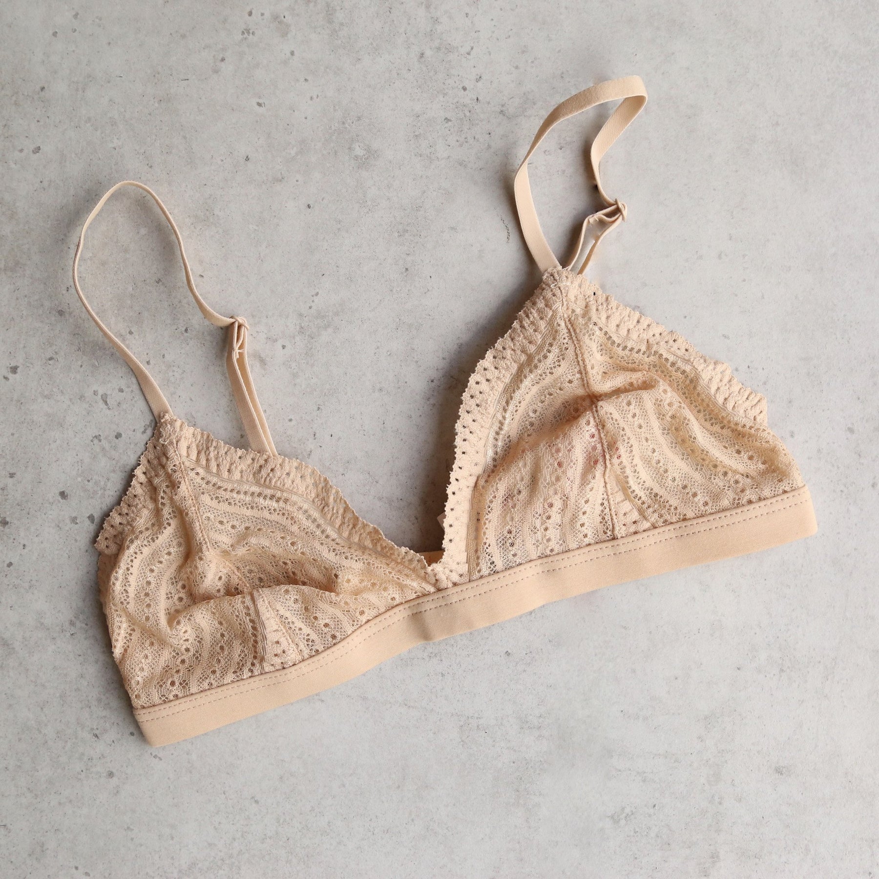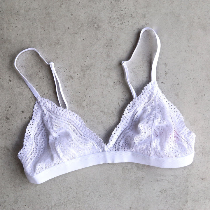 • Wire-free bra featuring chevron-lace cups with scalloped trim and wide elasticized band under bust