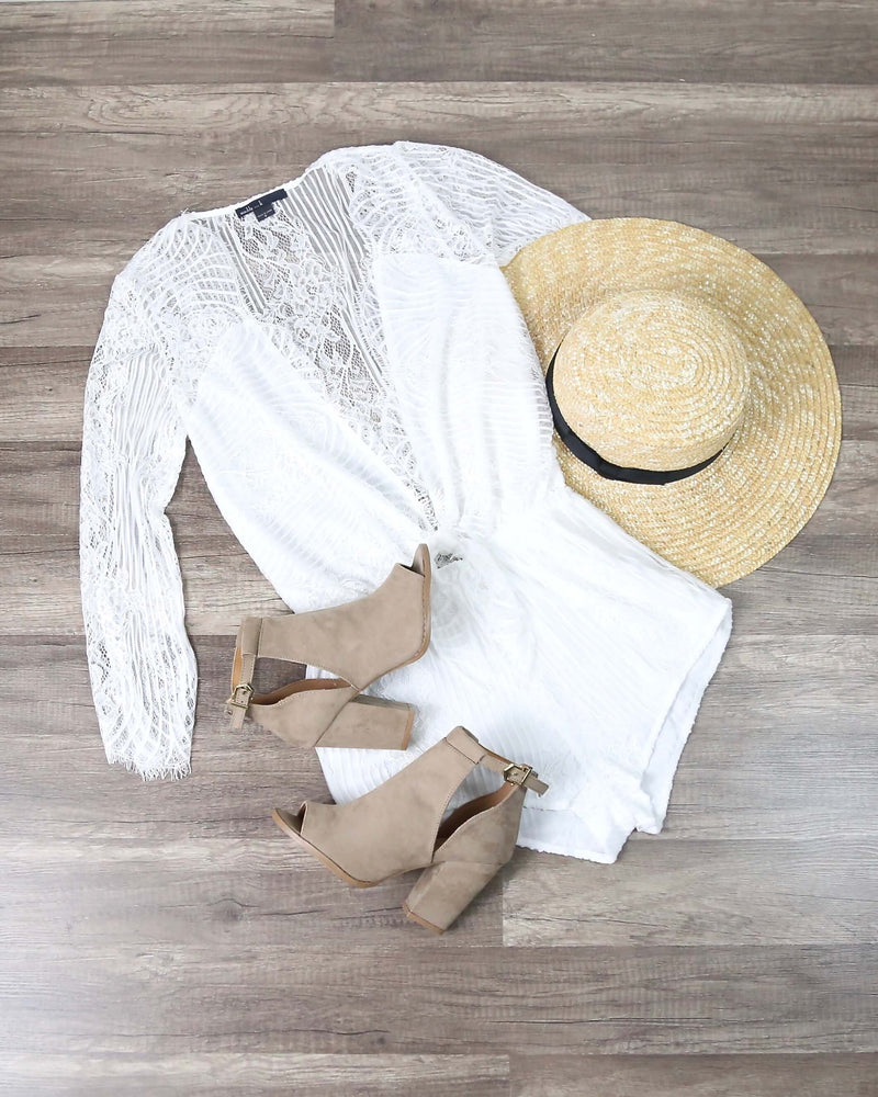 This romper will be perf for summer wedding festivities, concerts, festivals, bachelorette events, birthdays, girls night out... Actually, its perf for everything - basically. This white lace romper has a tie closure at front, partial lining, loose top, fitted bottoms, see-through lace design back & sleeves, and eyelash lace detailing. Perfect with lots of turquoise/silver and laced-up suede sandals to balance all that leg view.