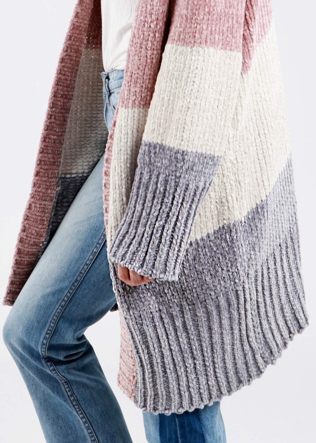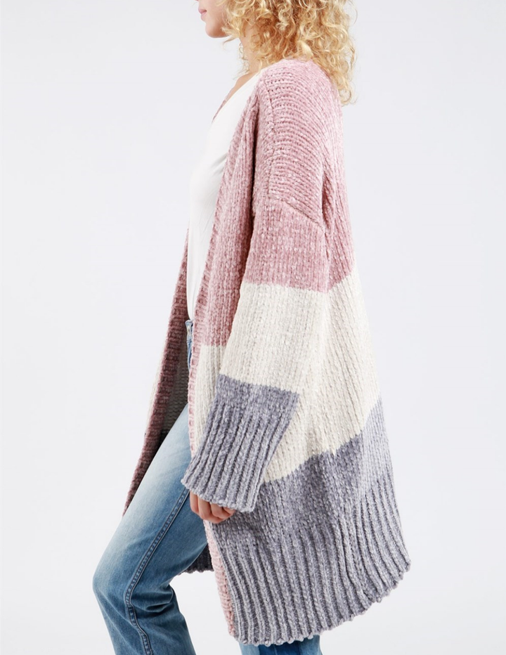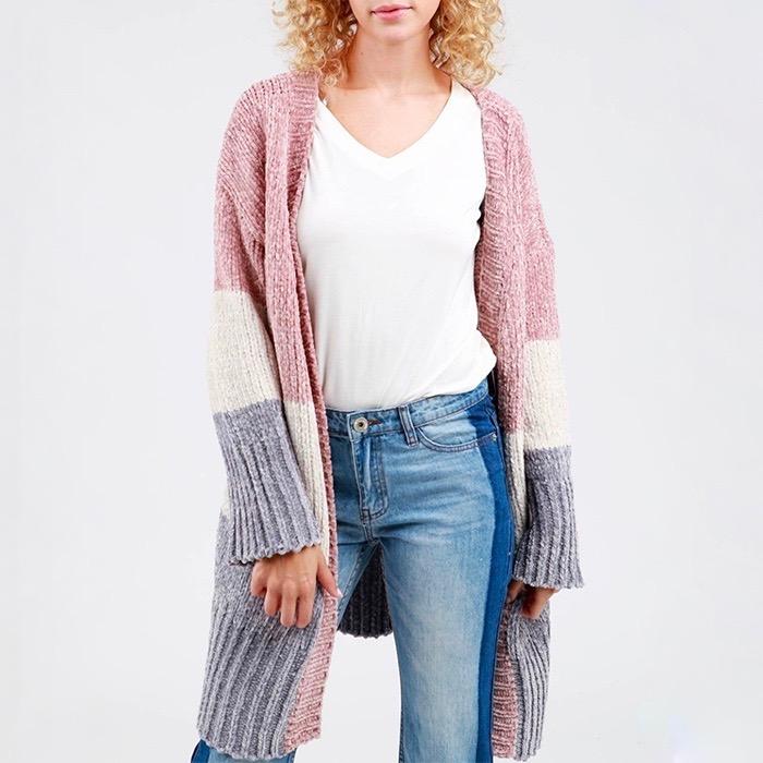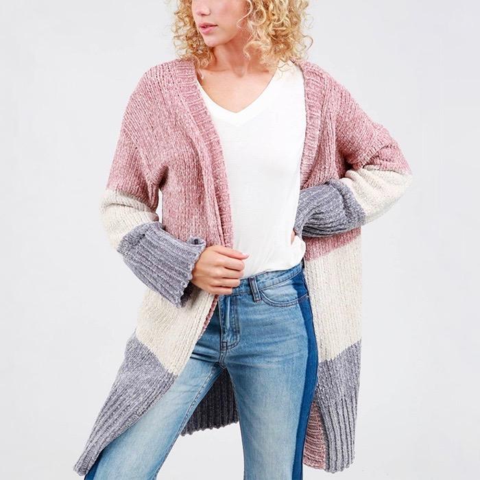 Three-tone open front velvet chenille long sleeve sweater cardigan