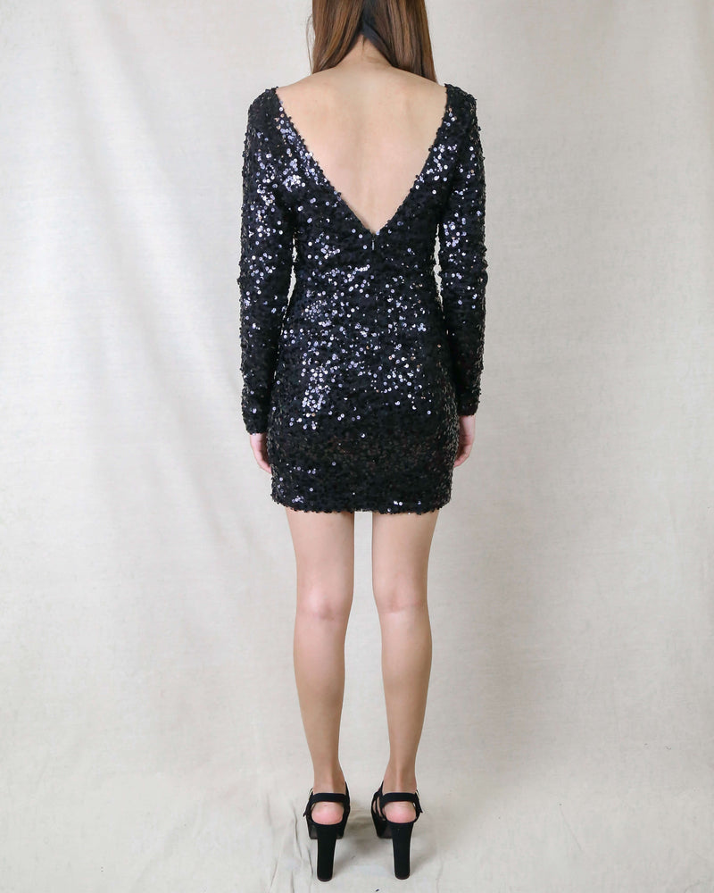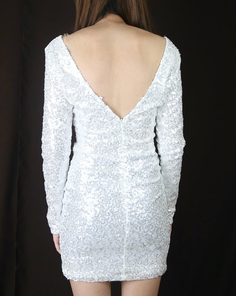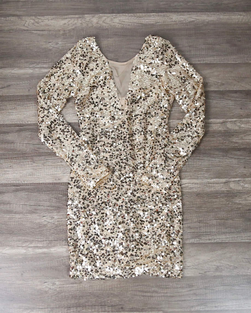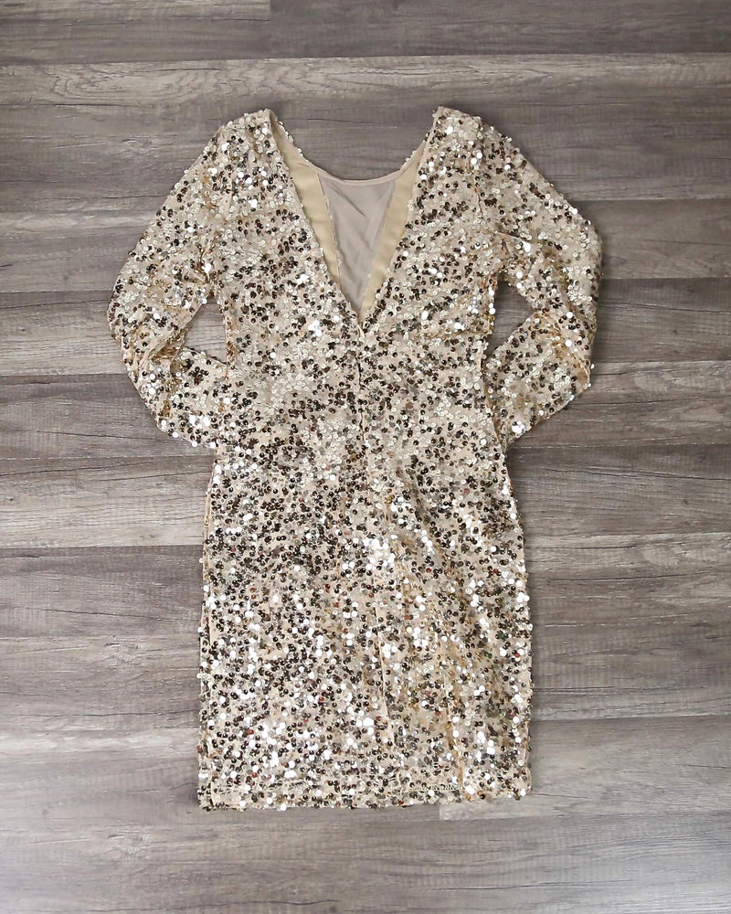 An amazing gold sequin dress that features long sleeves, a mesh front v panel, a deep v back neckline, and a hidden zipper with hook closure. This perfect number will go so well for multiple occasions. Perfectly paired with black or nude pumps.