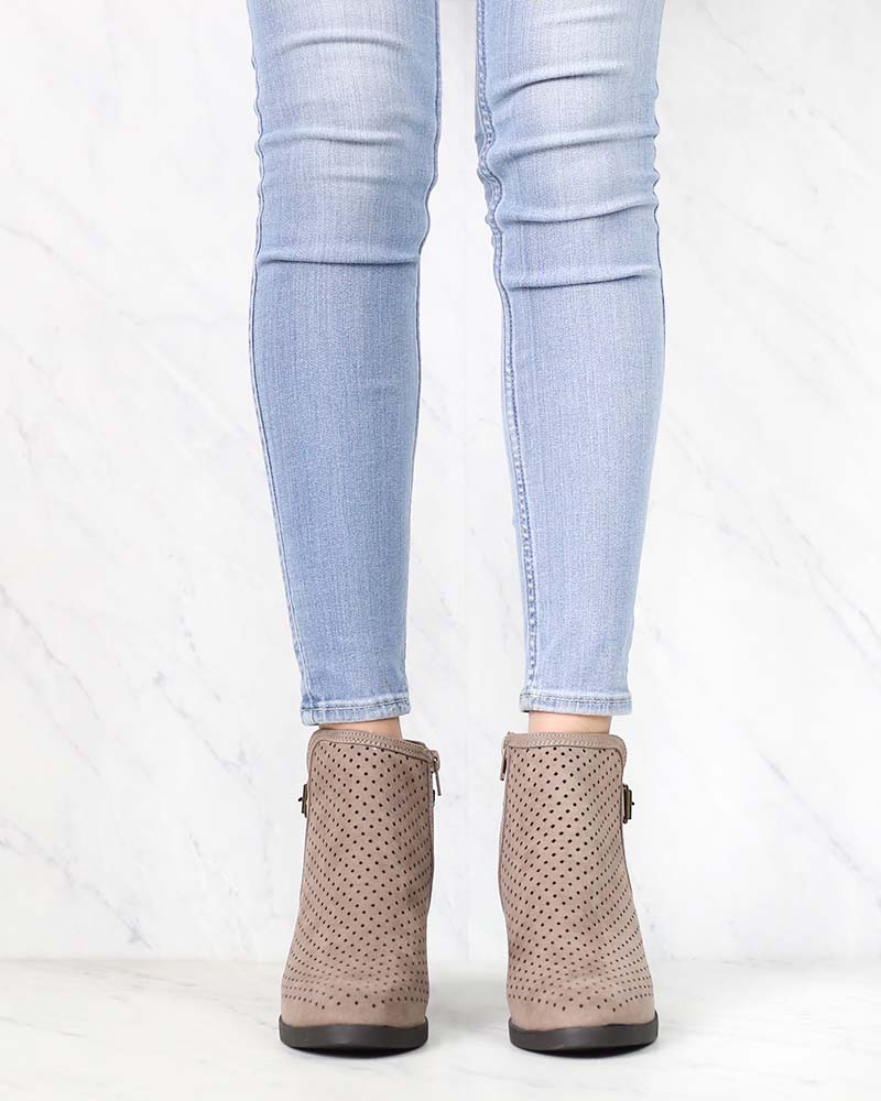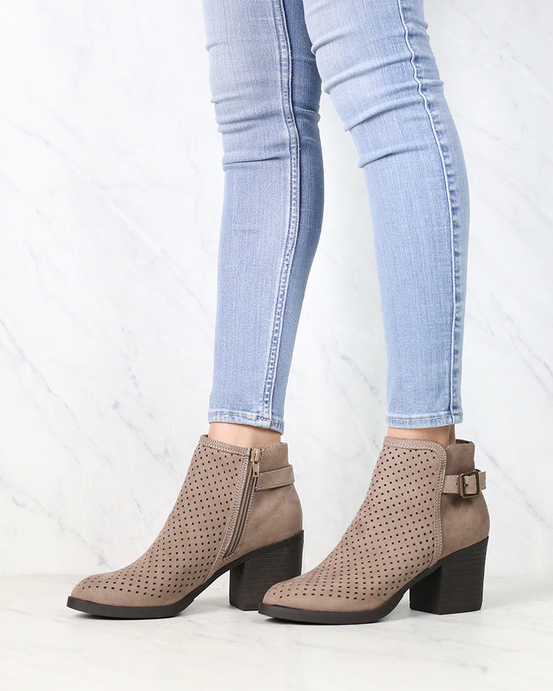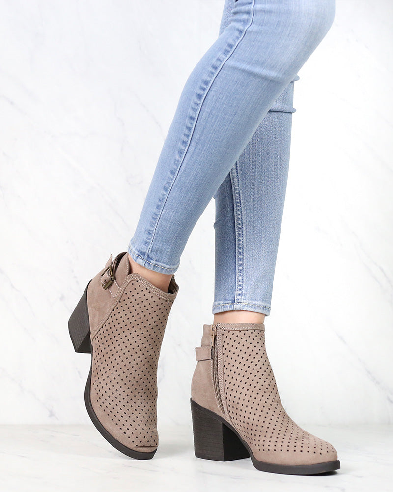 Diamond Perforated Back Buckle Faux Suede Ankle Bootie in Light Taupe