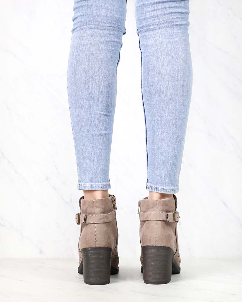 These faux suede ankle booties feature a back buckle and a diamond perforated design. Wear this with any outfit for a casual everyday look!