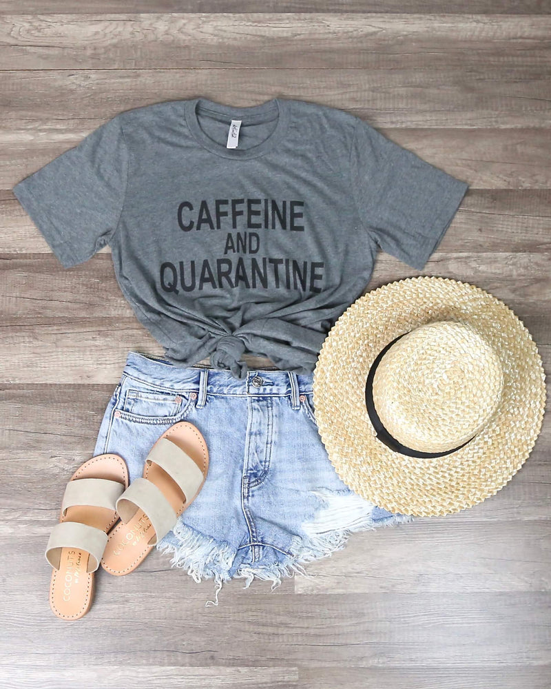 This super cute "Caffeine and Quarantine" tshirt is a funny graphic tee to lighten the mood. Pair this with denim shorts for a casual and cute look!