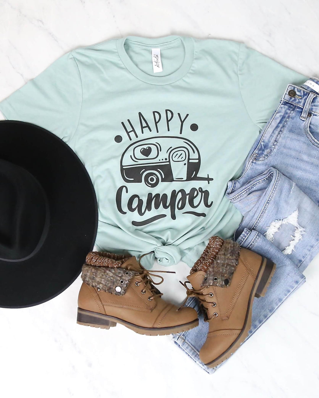 If you love the outdoors, why not express your love on a t-shirt to everyone? This graphic tee shows our love for camping! Pair this top with some distressed jeans and some cute booties. Have a great glamping!