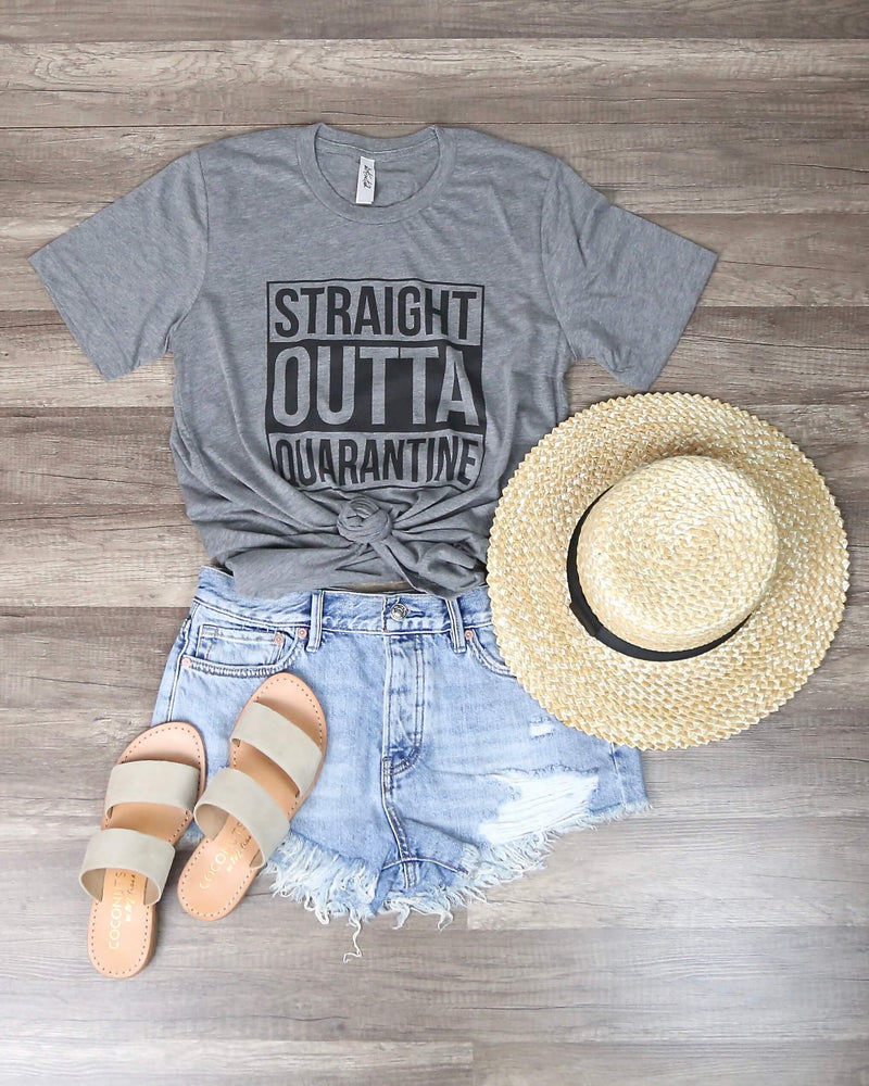 This super cute "Straight Outta Quarantine" tshirt is a funny graphic tee to lighten the mood. Pair this with denim shorts for a casual and cute look!