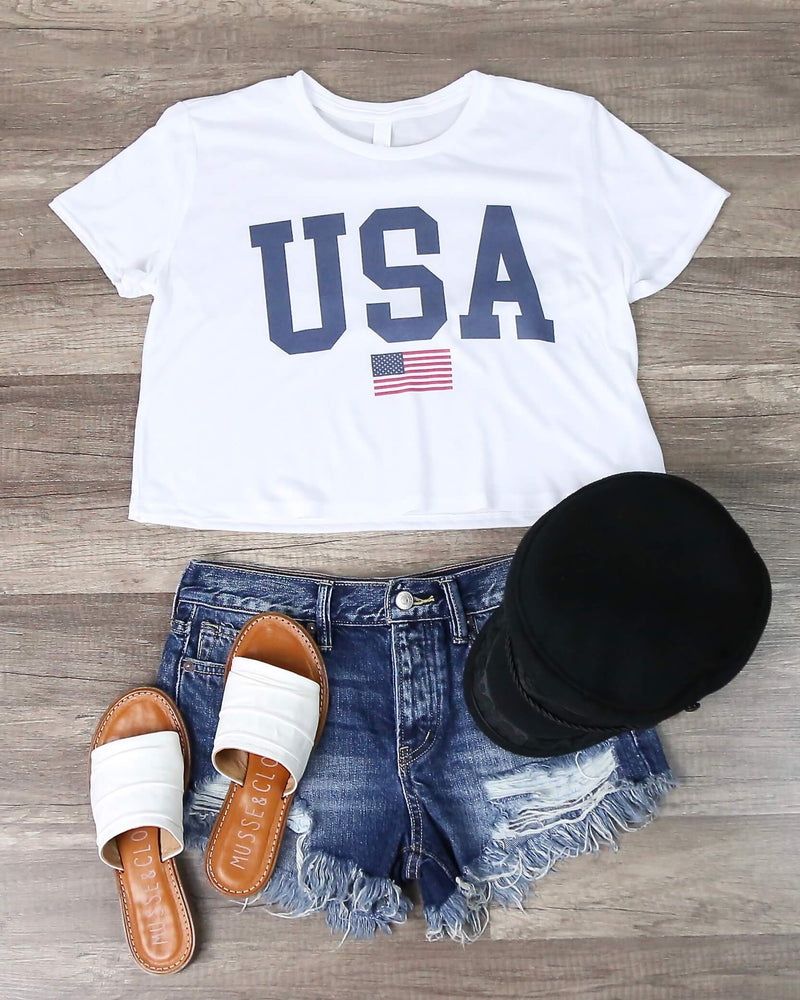 The perfect classic top, this cropped graphic tee is a must-have! This super cute top can be easily styled into your summer outfits. Wear this with your favorite pair of denim shorts for the perfect summer outfit!