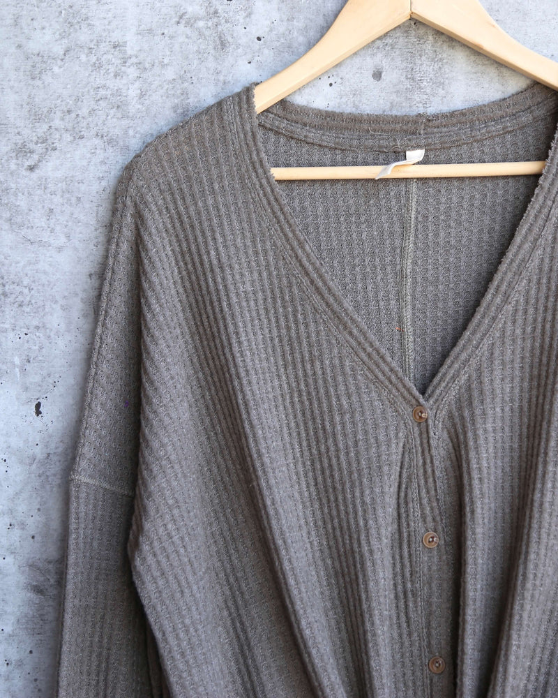 EVA Long Sleeve Thermal Waffle Knit V-Neck Button Down Lightweight Sweater in Olive