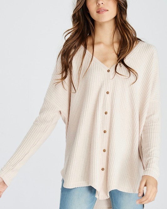 EVA Long Sleeve Thermal Waffle Knit V-Neck Button Down Lightweight Sweater in Taupe