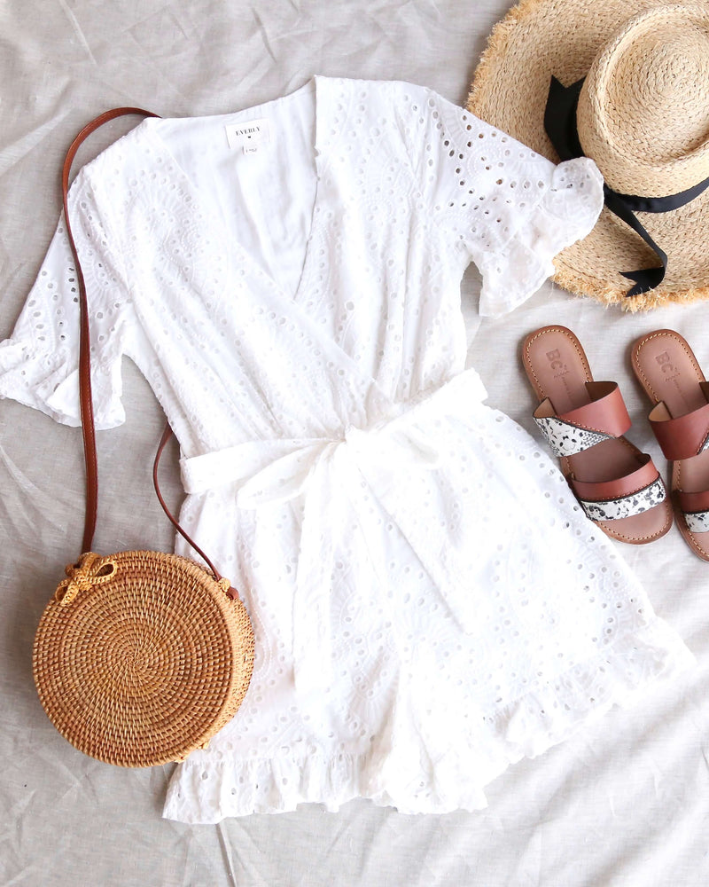 This cute romper with a ruffle hem, waist tie, and eyelet detailing is perfect for a summer getaway! Pair this with your favorite pair of sandals for a perfect summer look.