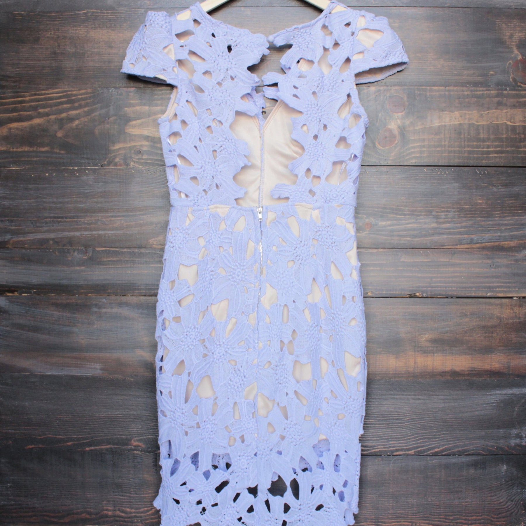 Make an impression with this gorgeous lilac dress. Features a nude lining, an elastic pea button back closure, partial open back cut out design, and cap sleeves.