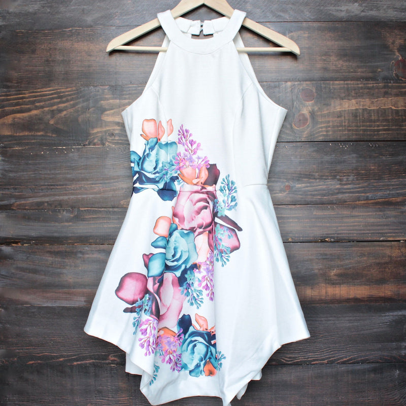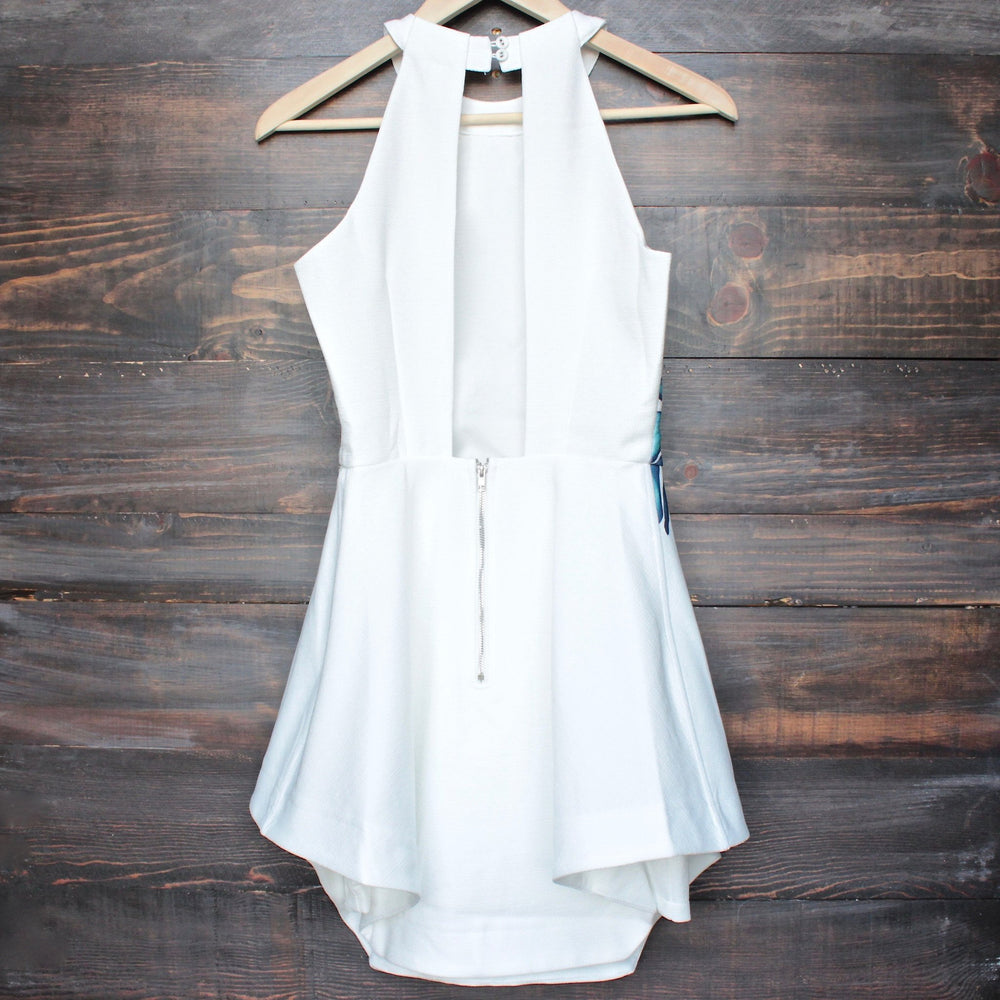 Be the center of attention in this adorable white dress that features a unique floral print, open back, high neck, and exposed zipper.