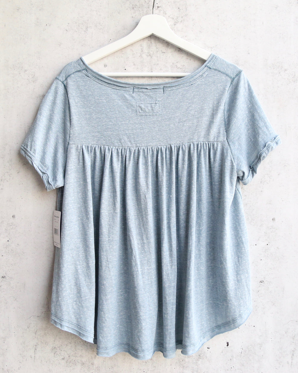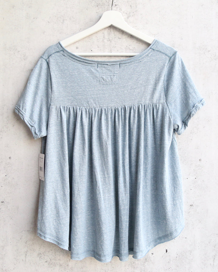 The All You Need top from Free People maintains a modern look simple with raw seam details throughout. It features a v-neck, short sleeves, pullover style, and a gathered back yoke.