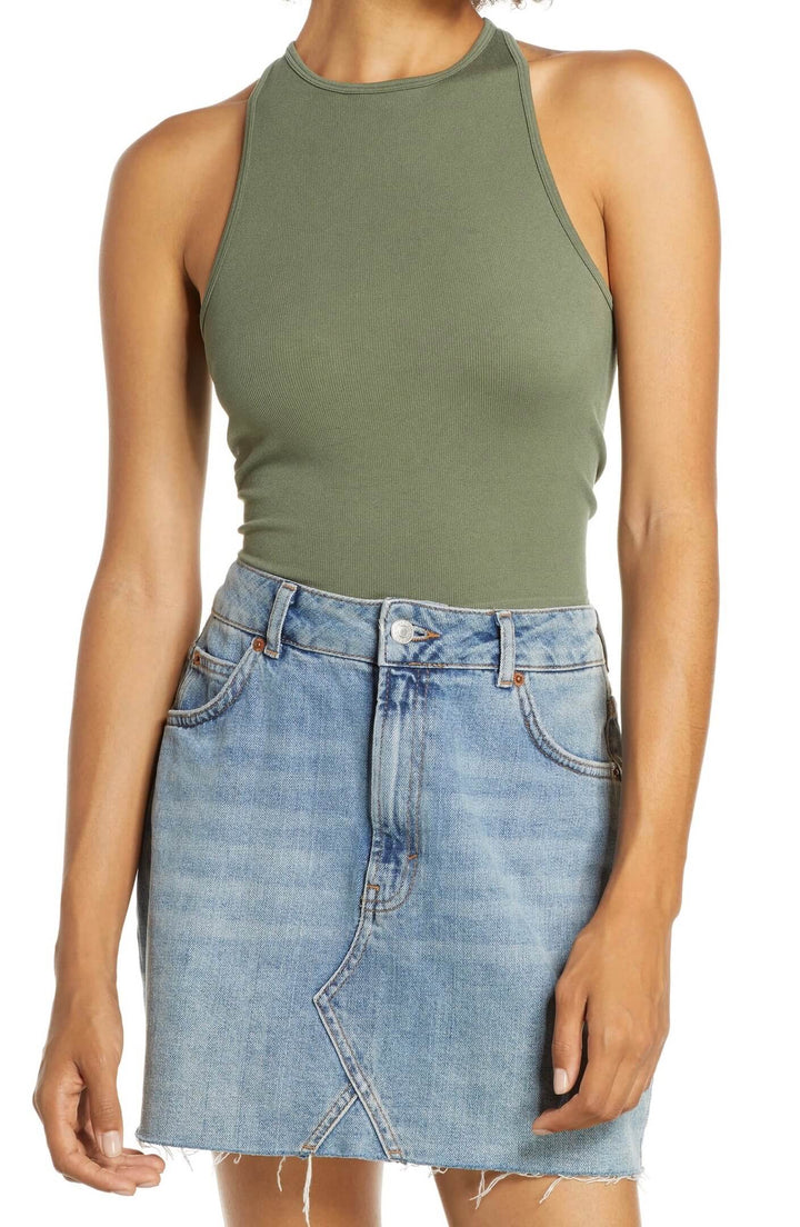 Essential racerback cami featured in a form-fitting ribbed design with a slightly cropped silhouette. It features a high neck, stretch fit, and is also semi-sheer. This sleeveless cami has a cropped hemline.