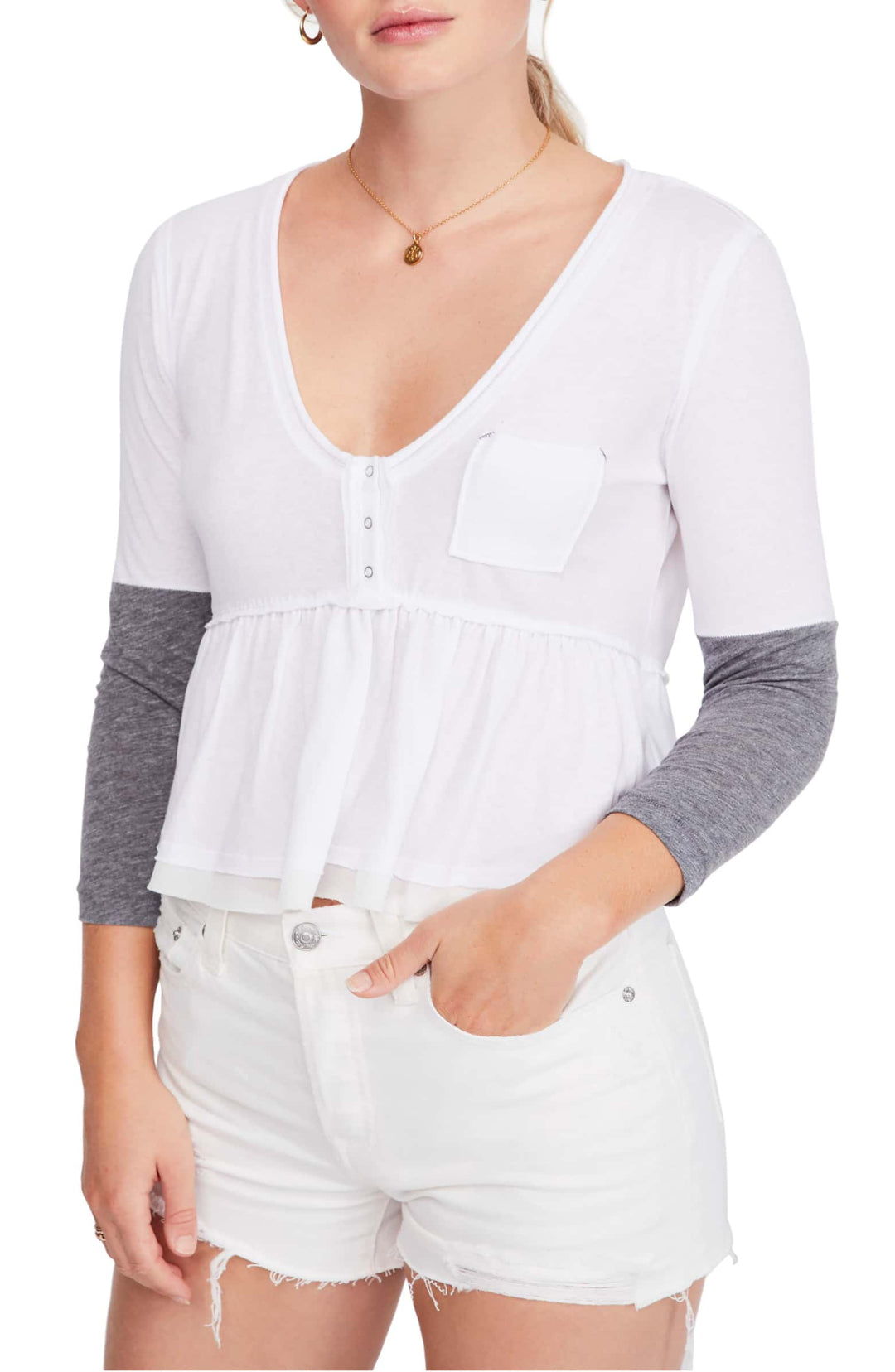 This colorblocked cotton top from Free People is surprisingly charming with contemporary trimming. It features a peplum hem with raw edges, v-neck, pocket on the left, and has a relaxed fit. Will become an instant favorite! Pair the top with some denim shorts.