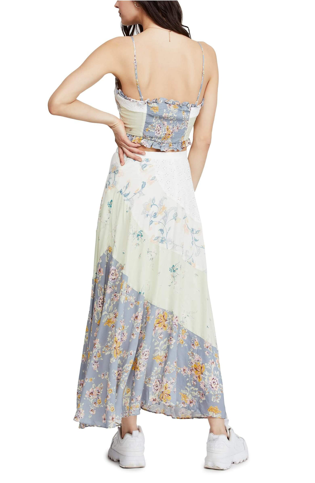 The perfect dress for your next garden party would be this this boho-chic two-piece set that features a floral print, tiny ruffles, and panels of embroidered lace. It also has a square neckline with its lace up crop top that has floral ruffles and a tiered midi skirt that has a banded waist and a concealed side zip closure.