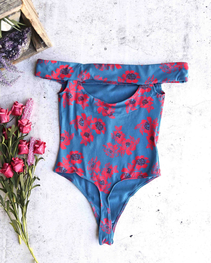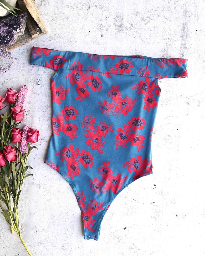 An off-the-shoulder neckline and fun floral print underscore the vacation-ready vibes of this flirty bodysuit given a comfortable, lightweight fit from stretch cotton.